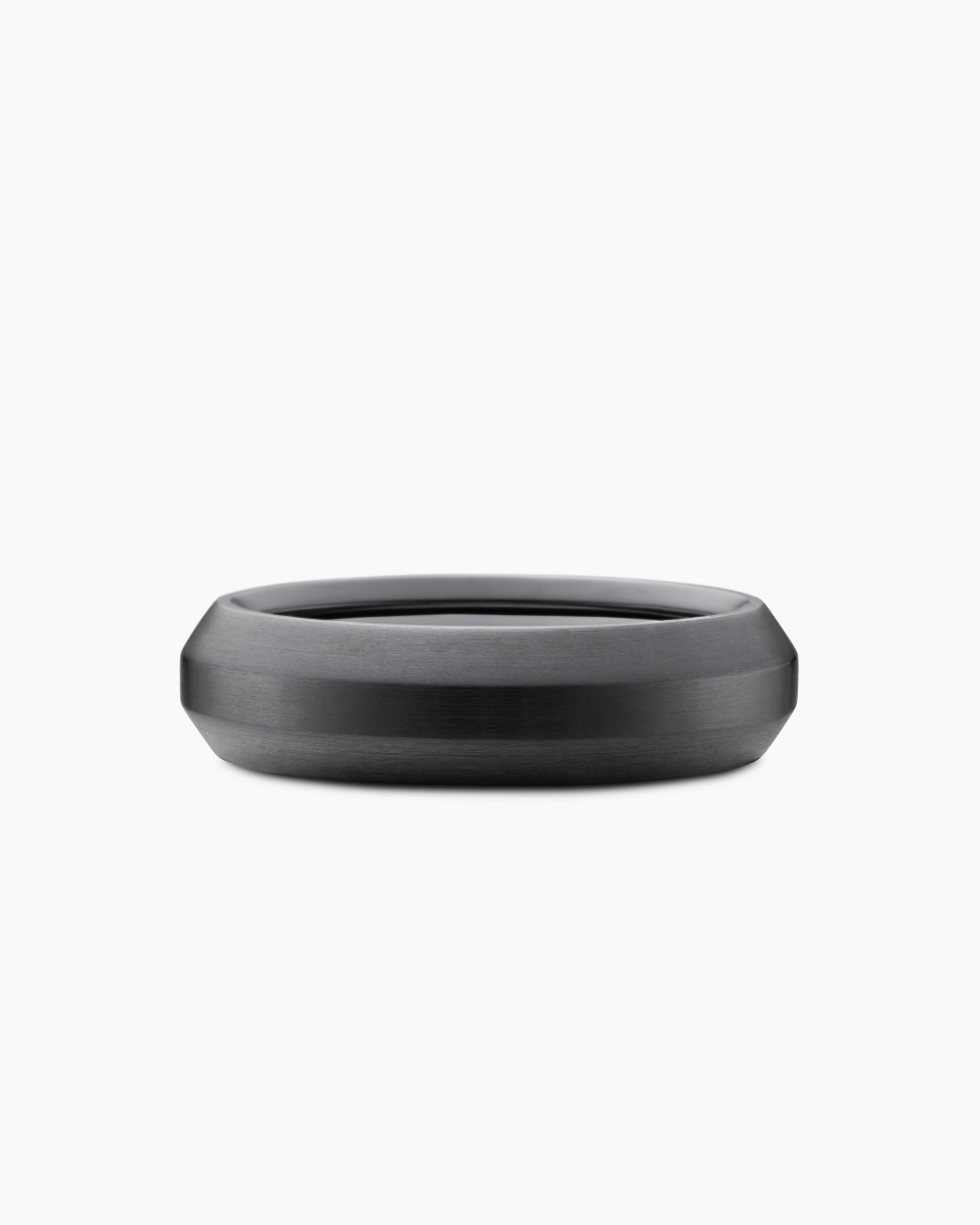 This hand-finished piece is inspired by beveled edges. Black titanium with sterling silverPavé black diamonds, 1.22 total carat weightRing, 6mm