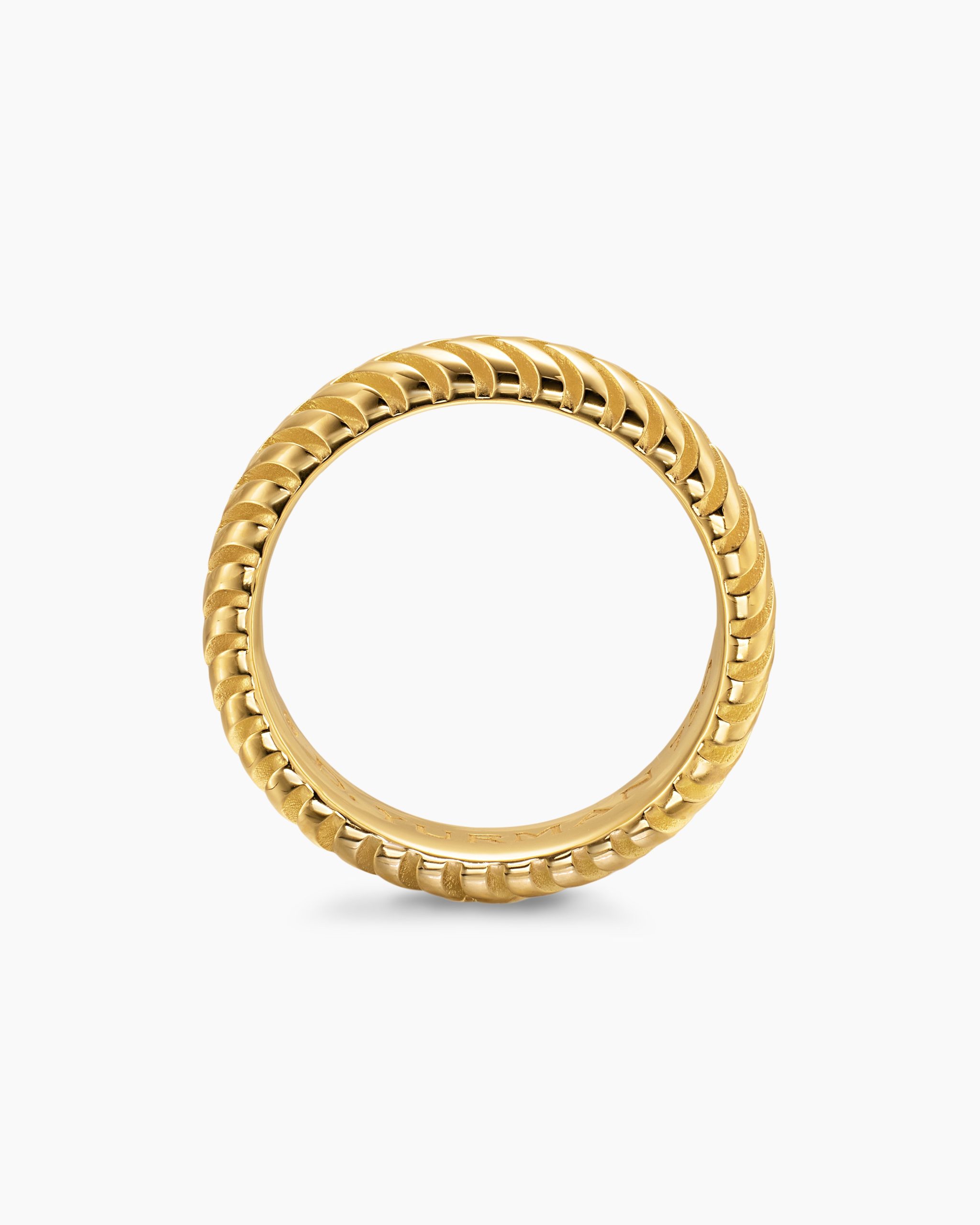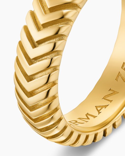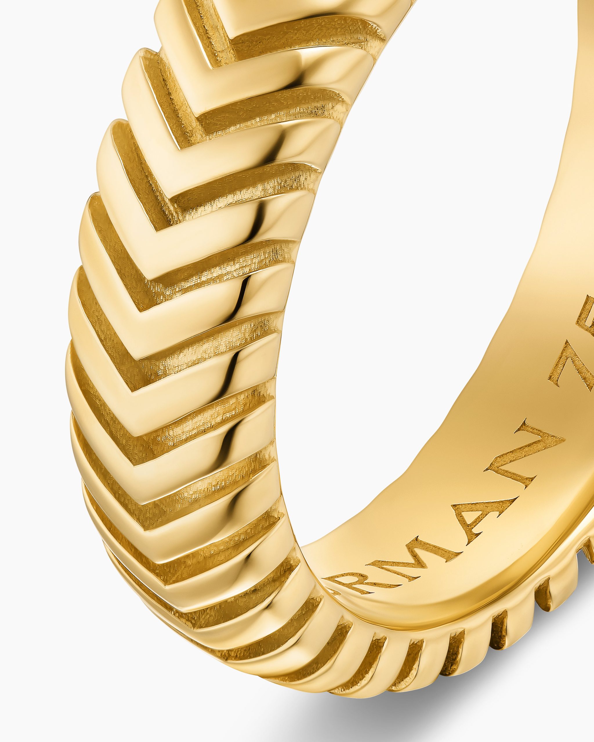 Marked by its double-helix pattern, Chevron is a mirror image of Cable, the house’s signature motif. The ancient V-shaped design offers a sense of modern sophistication, expertly crafted in refined materials, with deep cuts, precise angles, and a play of light and dark to evoke a feeling of forward momentum in the pursuit of excellence. Its elevated look fuses luxury and practicality for everyday wear, imbuing an essence of timelessness and versatility.18-karat yellow goldRing, 6mmThis item can be engraved. Please contact customer care for more information.