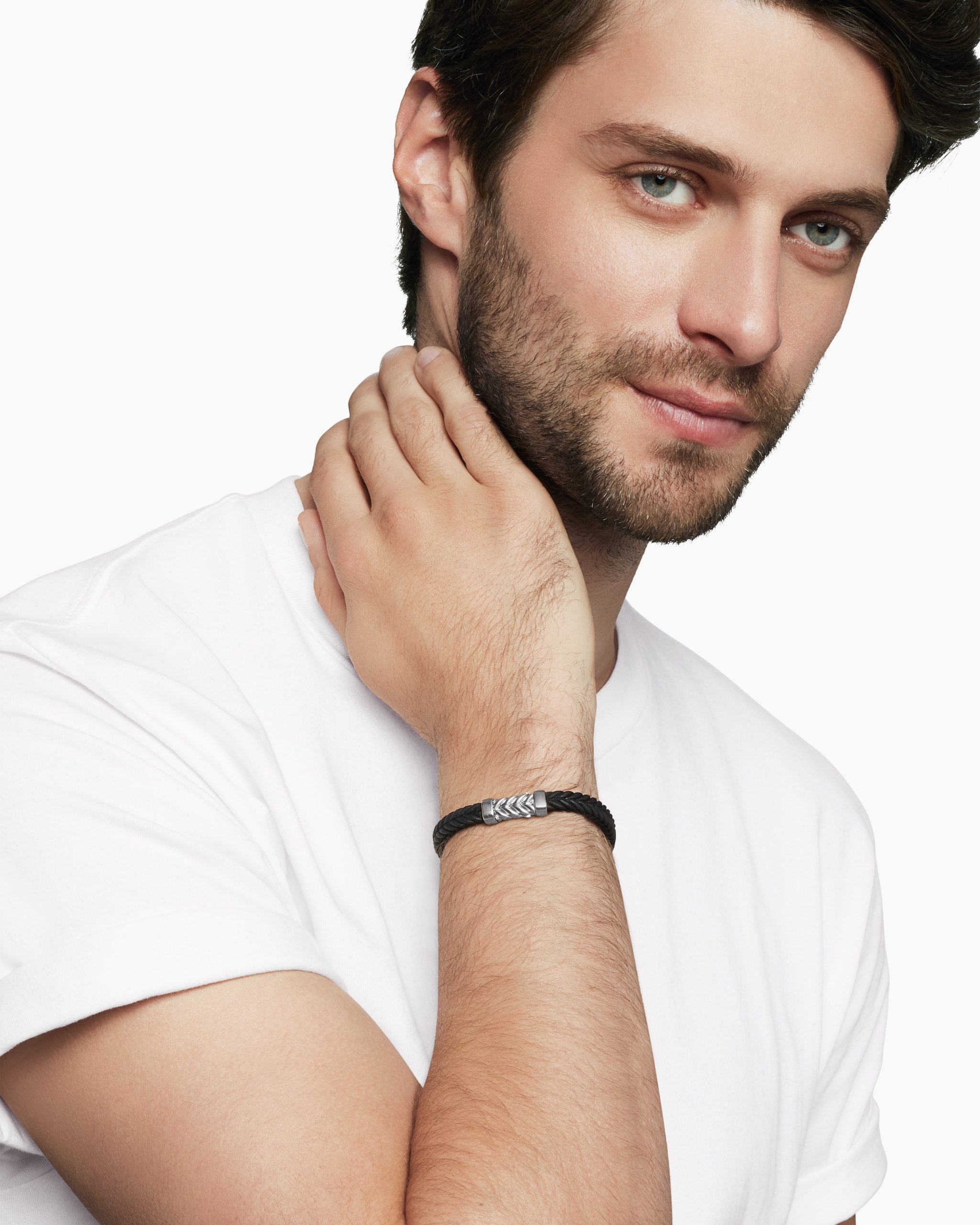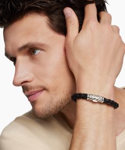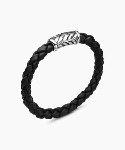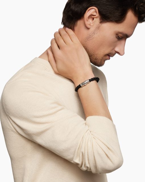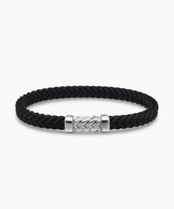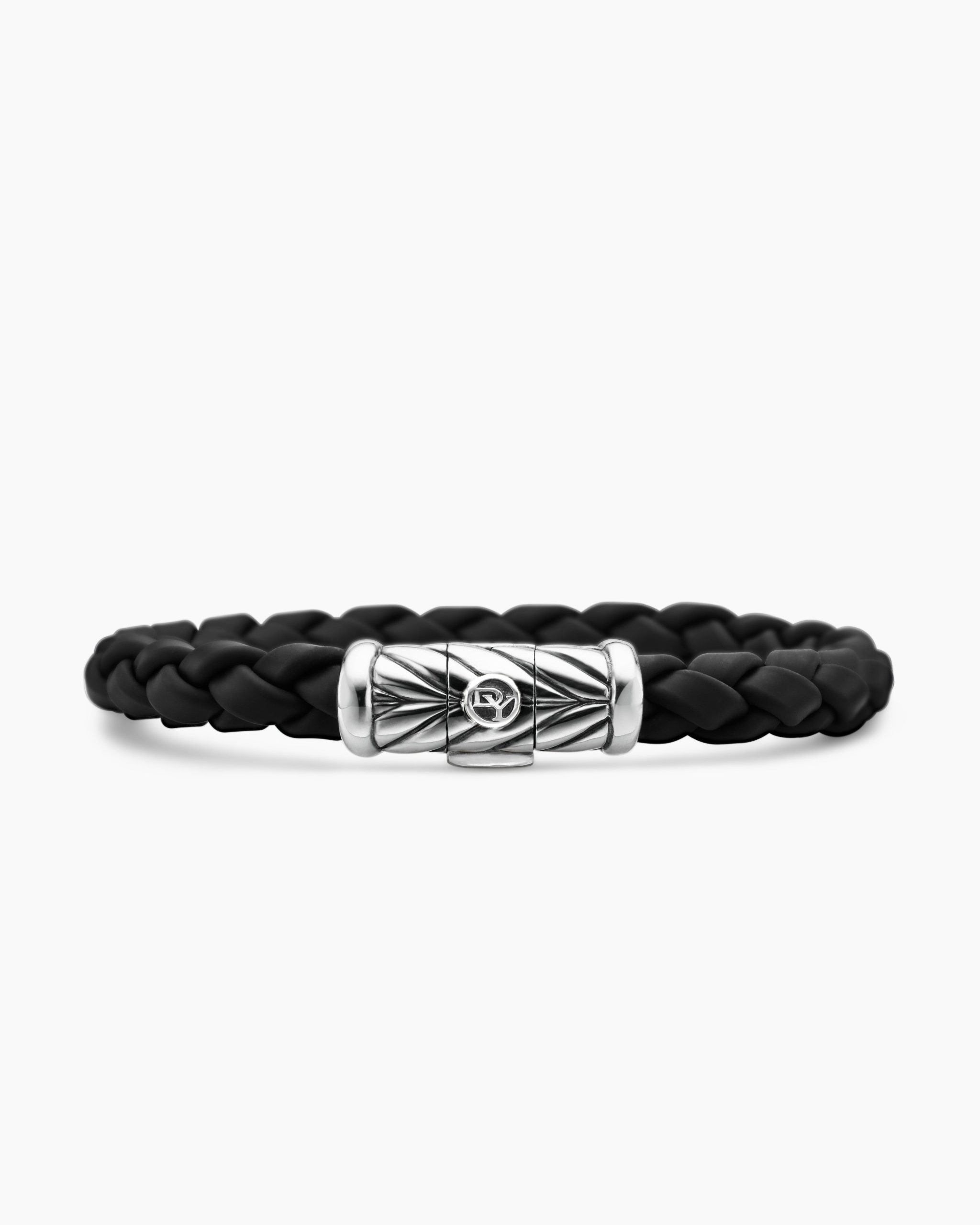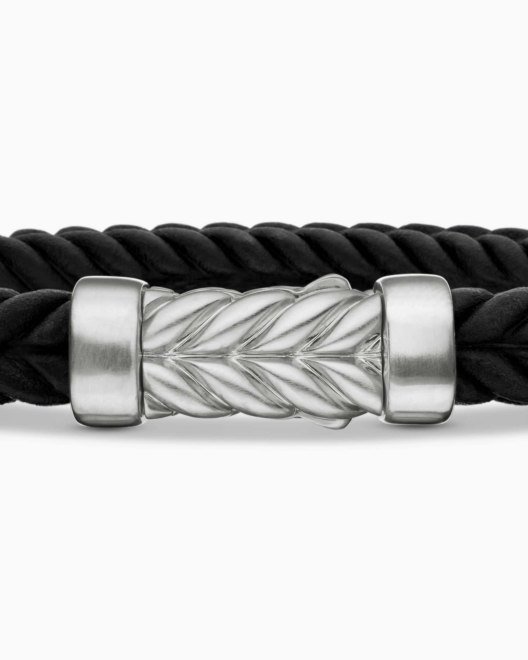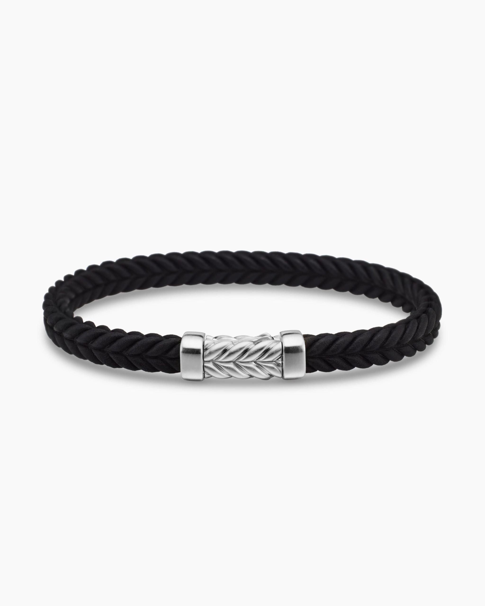 Marked by its double-helix pattern, Chevron is a mirror image of Cable, the house’s signature motif. The ancient V-shaped design offers a sense of modern sophistication, expertly crafted in refined materials, with deep cuts, precise angles, and a play of light and dark to evoke a feeling of forward momentum in the pursuit of excellence. Its elevated look fuses luxury and practicality for everyday wear, imbuing an essence of timelessness and versatility.Sterling silverBlack rubberBracelet, 6mmChevron station, 22.4 x 8.8mmHidden hook clasp