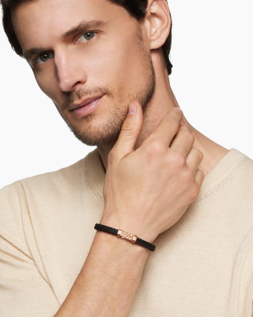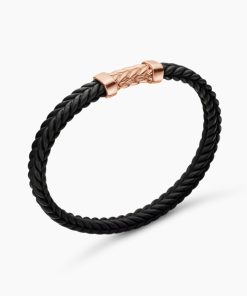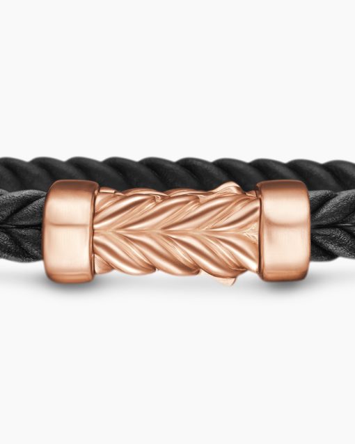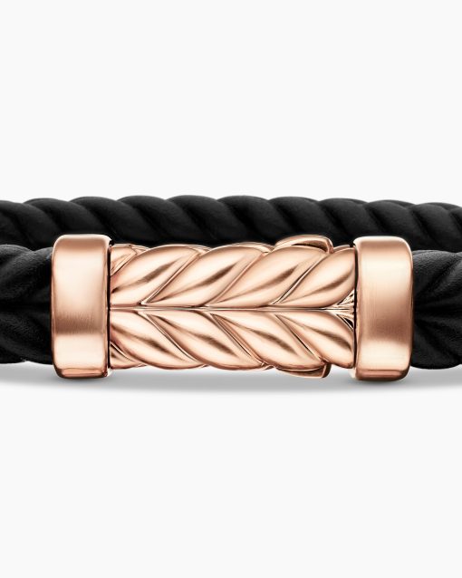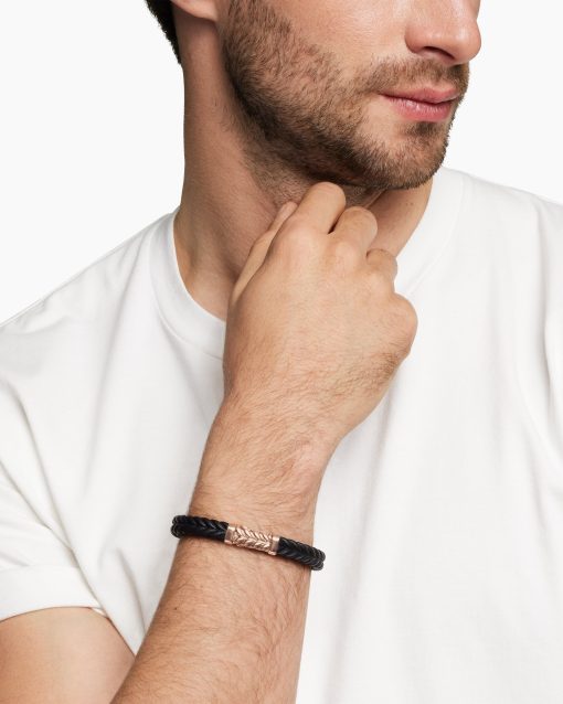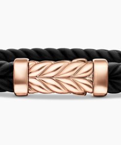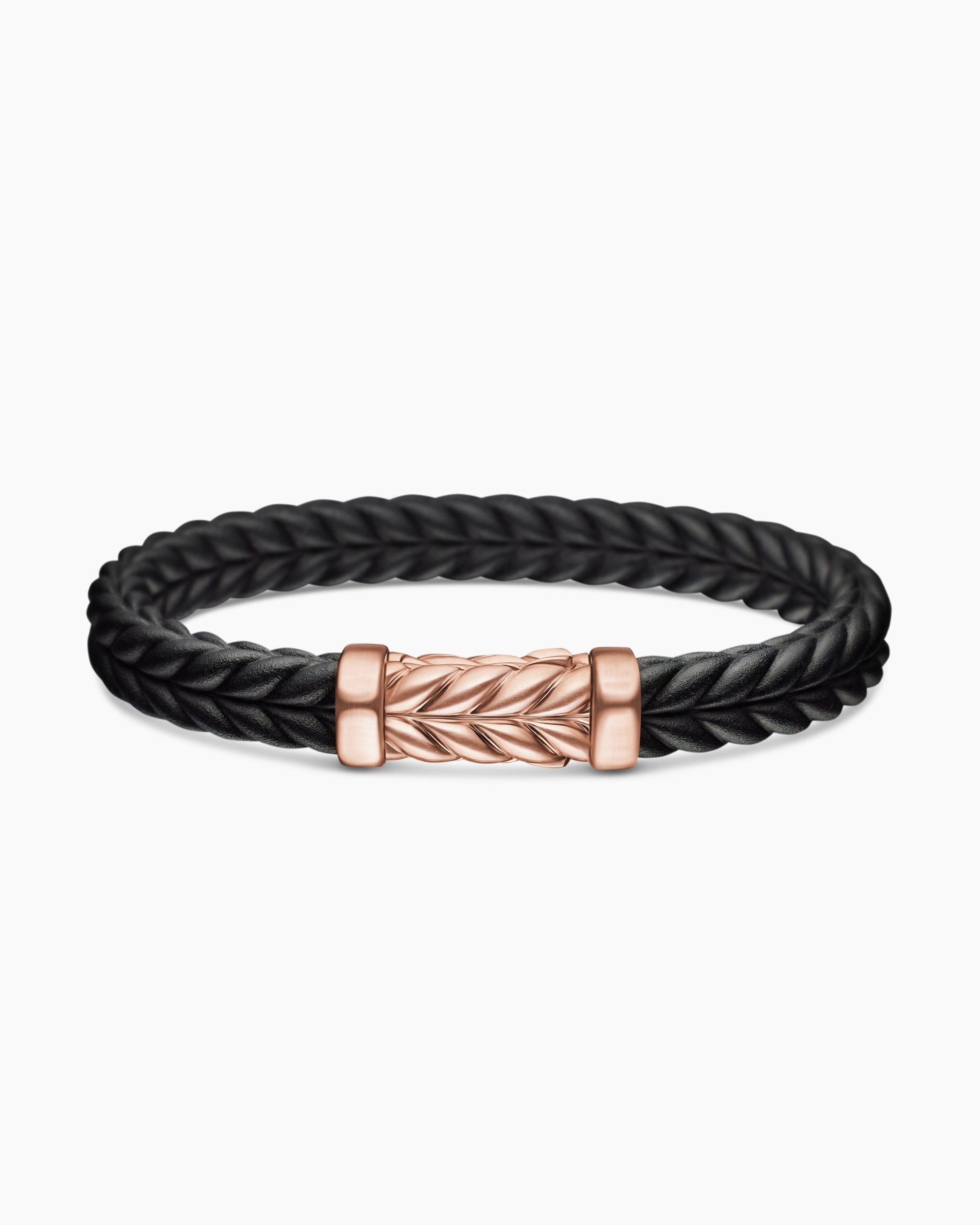 Marked by its double-helix pattern, Chevron is a mirror image of Cable, the house’s signature motif. The ancient V-shaped design offers a sense of modern sophistication, expertly crafted in refined materials, with deep cuts, precise angles, and a play of light and dark to evoke a feeling of forward momentum in the pursuit of excellence. Its elevated look fuses luxury and practicality for everyday wear, imbuing an essence of timelessness and versatility.18-karat rose goldBlack rubberBracelet, 9mmChevron station, 28.3 x 11.5mmHidden hook clasp