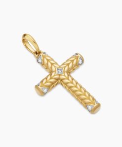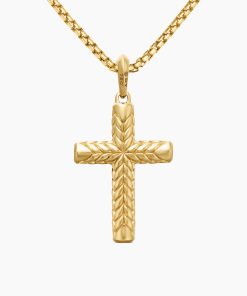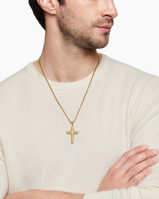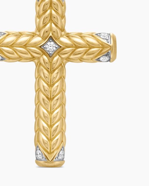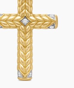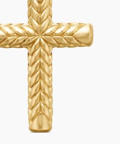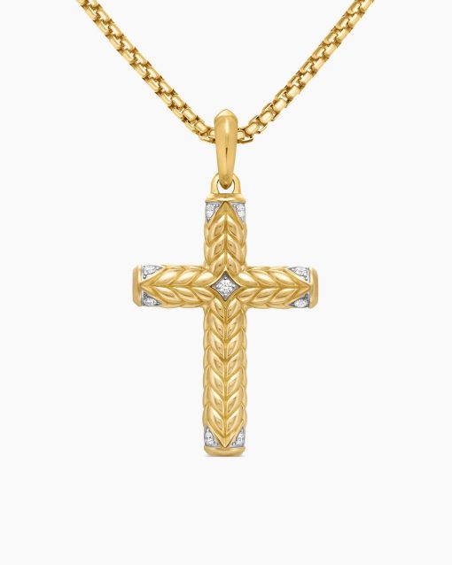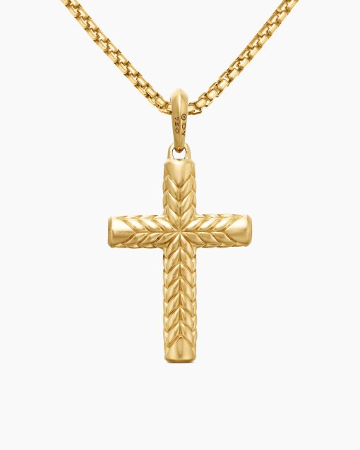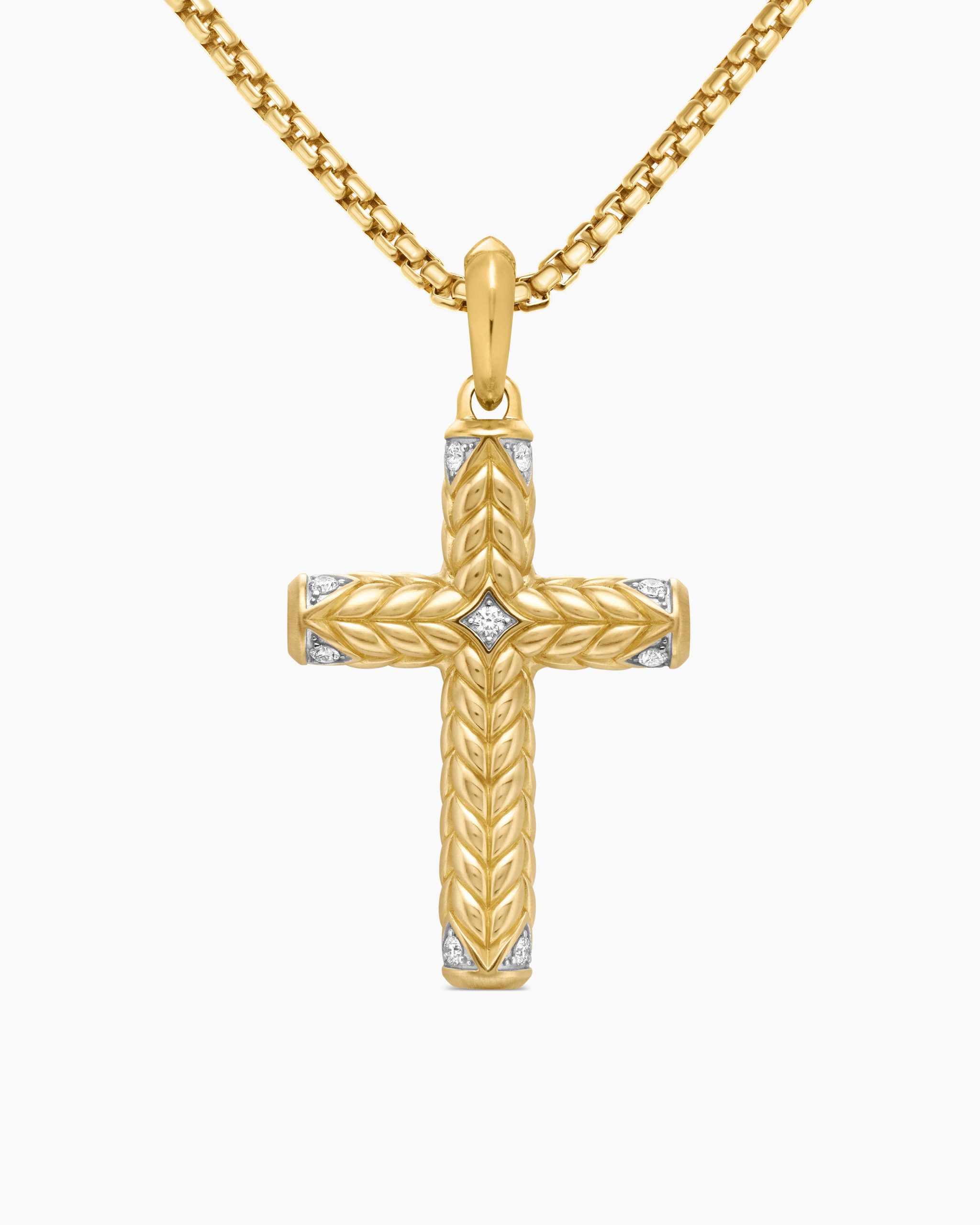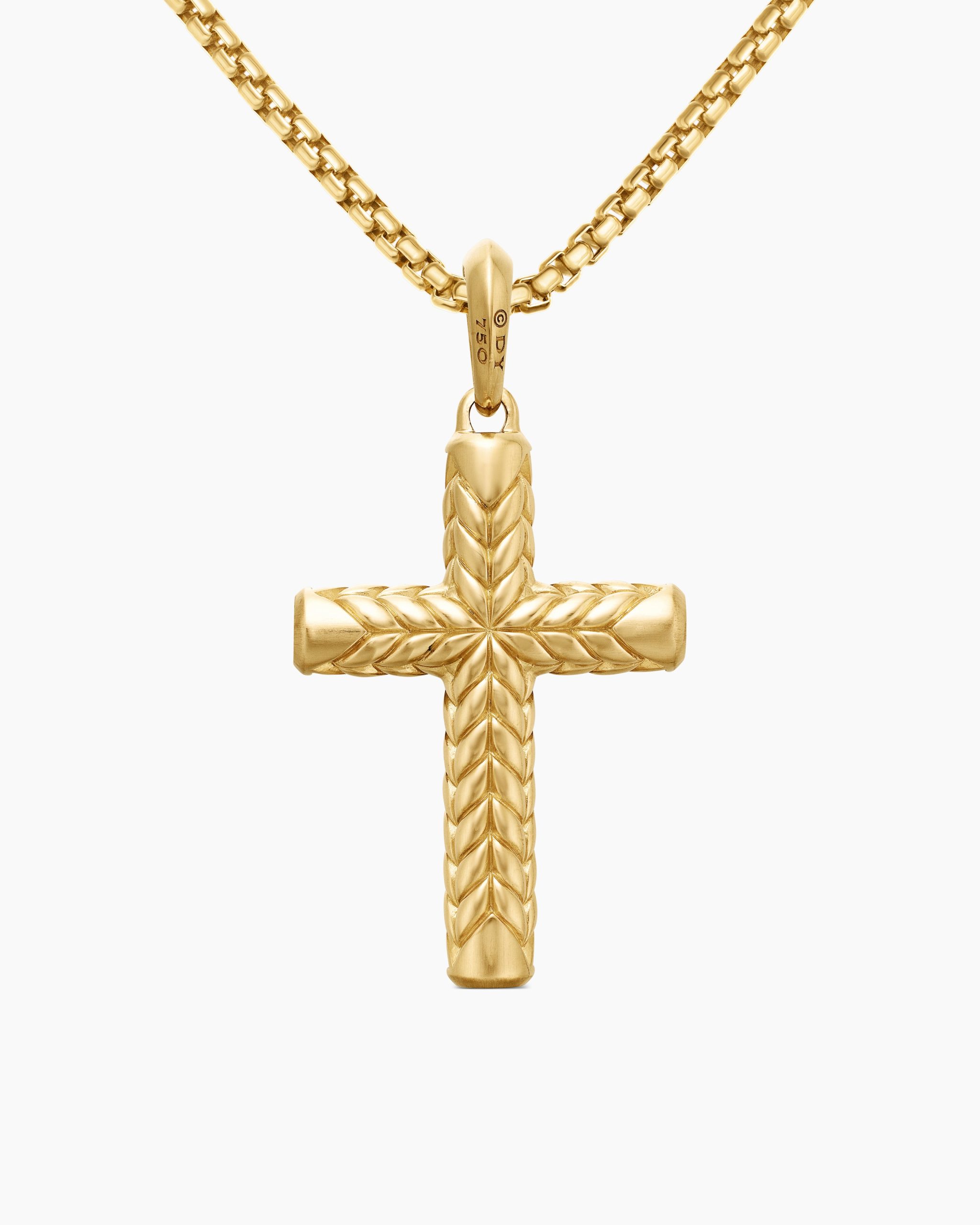 David Yurman skillfully reinterprets chevron—the ancient V-shaped pattern used in architecture and art—in this modern, sculptural collection. Viewed in relation to one another, each half of the motif is a mirror image of Cable. 18-karat yellow gold Pavé diamonds, 0.27 total carat weightCross, 49 x 26.6mmPlease note: cross only; chain sold separatelyShown with: Box Chain