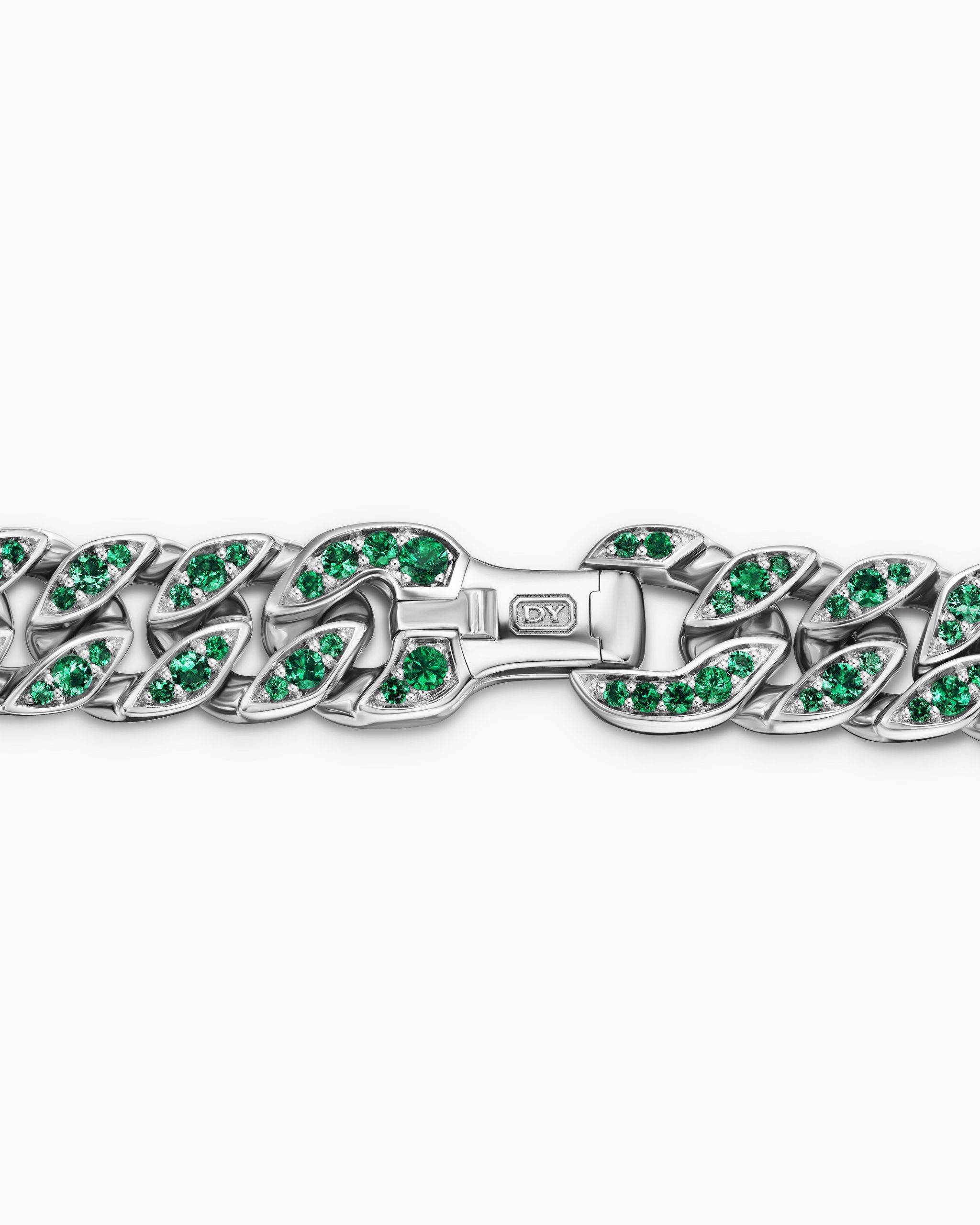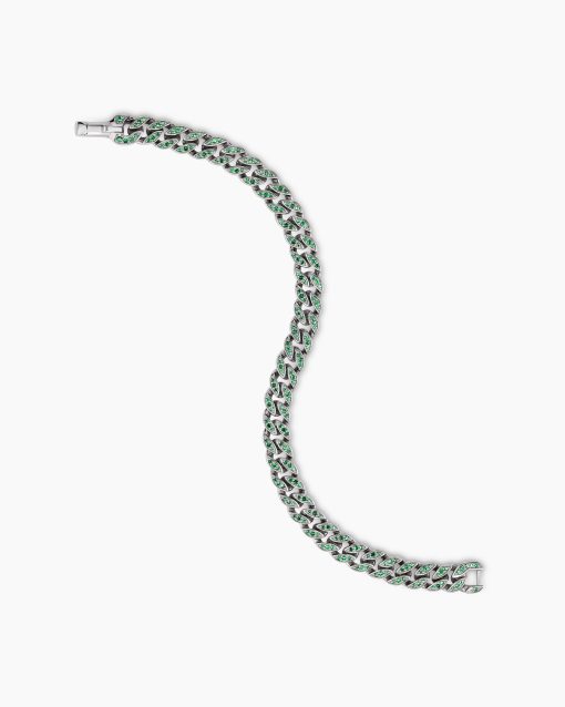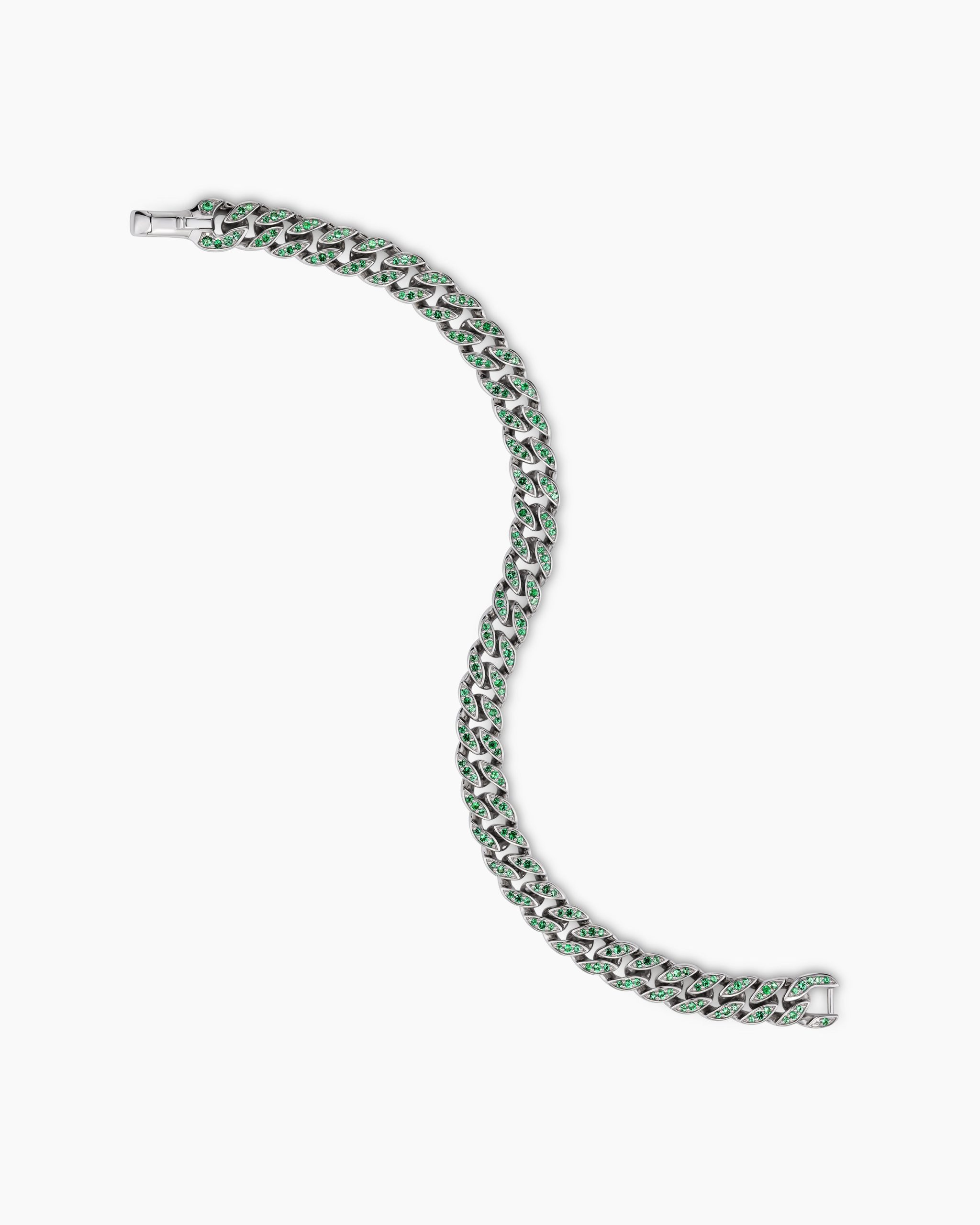 Inspired by David’s passion for horses, Curb Chain is the most elevated expression of our signature chain links. Its timeless elegance is rooted in the traditional equestrian bridle tack used to create control and stability during moments of speed. Forged precious metal is carved into Cable-like S-curves, each link crafted with impactful precision and hand-assembled with the next, culminating in a striking chain engineered for effortless movement.Inspired by Miami’s magnetic atmosphere, landscapes, and tropical sunsets, vibrant designs feature bold and semi-precious stones in electric pinks, neon greens, cobalt blues, and fiery oranges. These dynamic and radiant pieces embody the excitement and vitality of the city.Visit our Miami Design District flagship and learn more about the store’s dramatic design.18-karat white goldPavé-set emeralds, total carat weight ranges from 1.23 to 1.37 (dependent on size)Bracelet, 8mmPush clasp