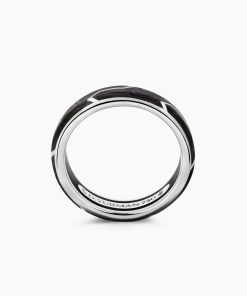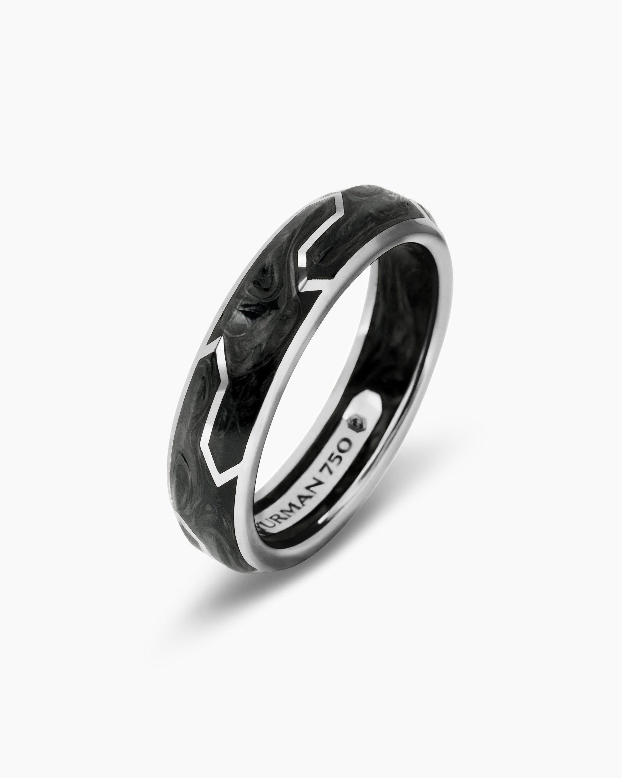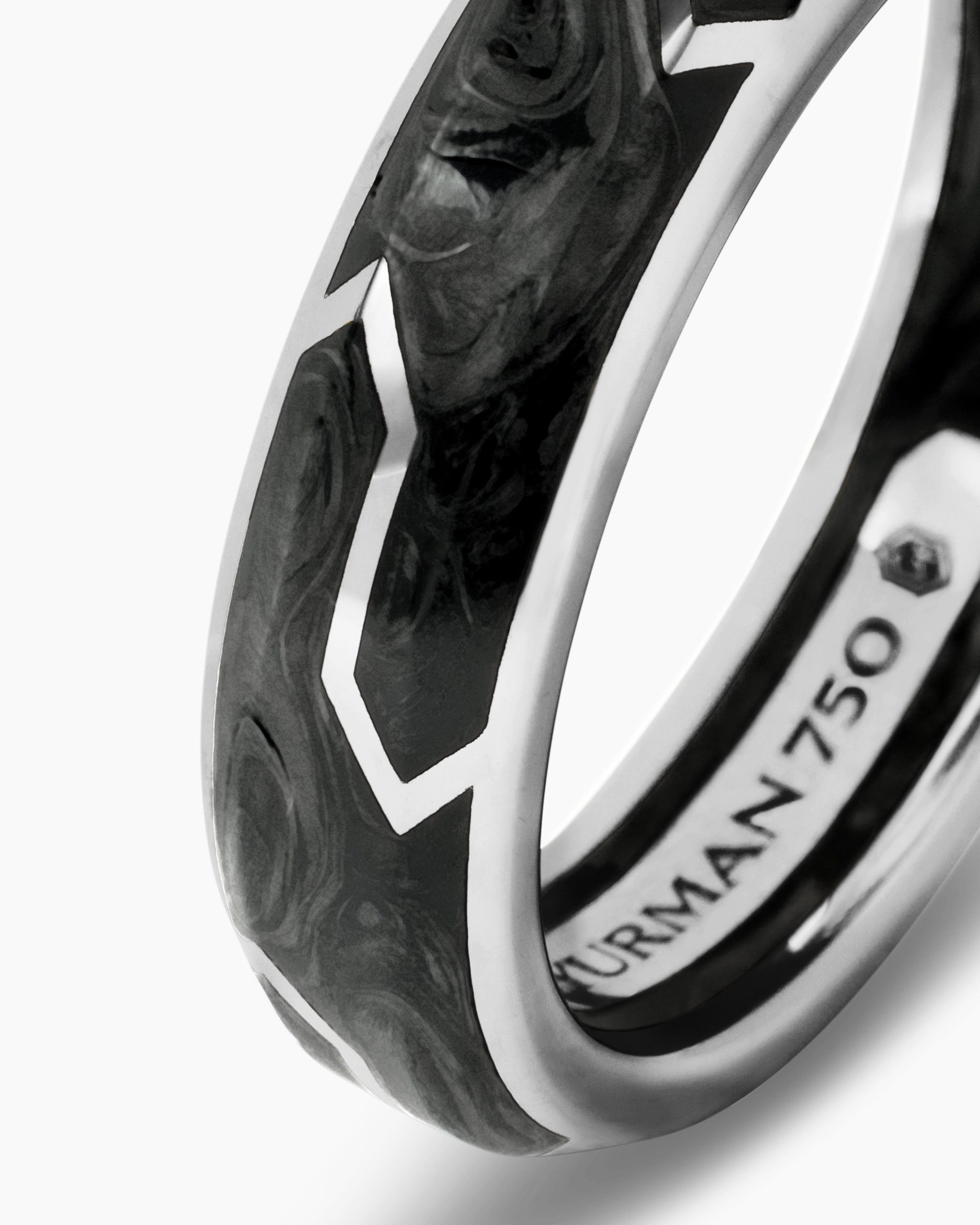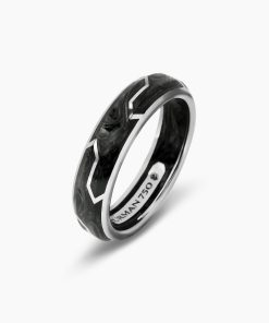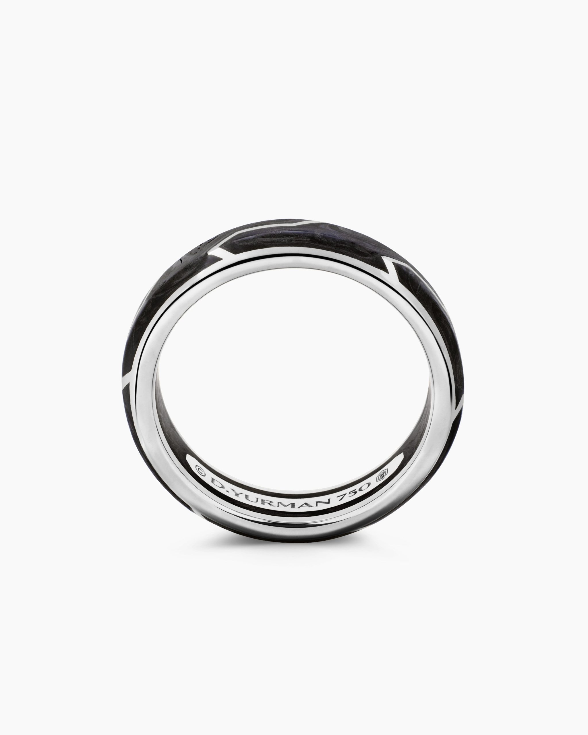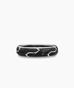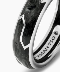 Forged carbon is a lightweight yet strong composite originally used in aeronautics and sports cars. For jewelry, David Yurman pioneered a technique which fuses the modern material and precious metal into innovative, graphic designs. 18-karat white goldForged carbonRing, 6mm