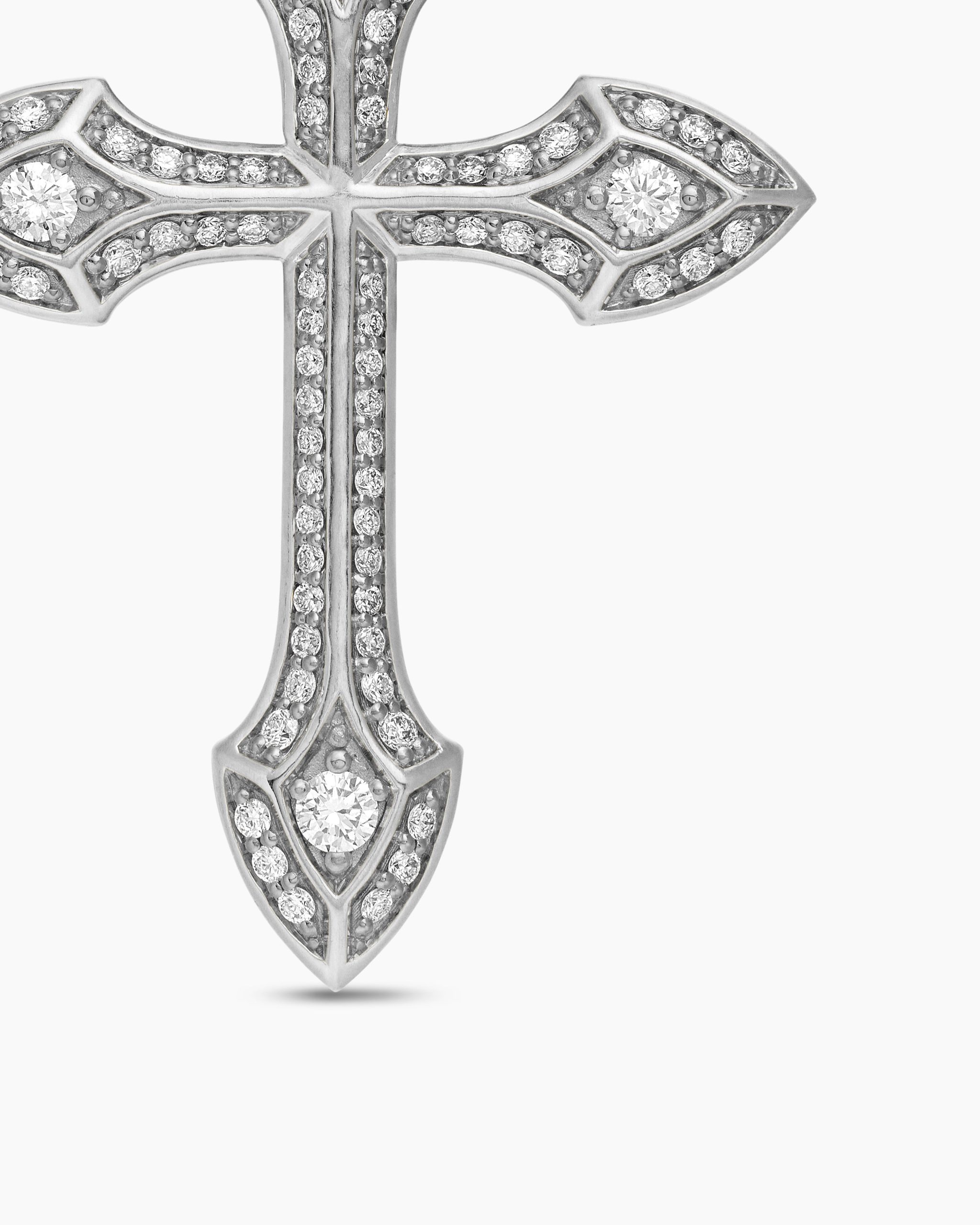 Once linked to spirituality and magic, today’s amulets are expressions of personal style. This collection reflects the modern man’s distinct identities with religious symbols, ancient charms and utilitarian motifs crafted from precious metals and gemstones. 18-karat white goldPavé diamonds, 0.58 total carat weightCross, 36.5 x 27.5mmPlease note: cross only; chain sold separatelyShown with: Box Chain
