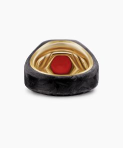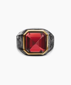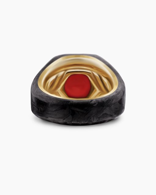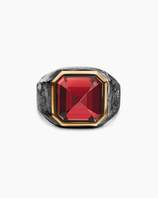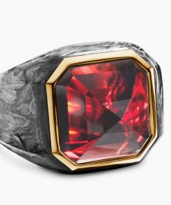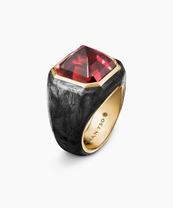 Forged carbon is a lightweight yet strong composite originally used in aeronautics and sports cars. For jewelry, David Yurman pioneered a technique which fuses the modern material and precious metal into innovative, graphic designs. 18-karat yellow goldForged carbonGarnet, 14.2mmRing, 17.7mm