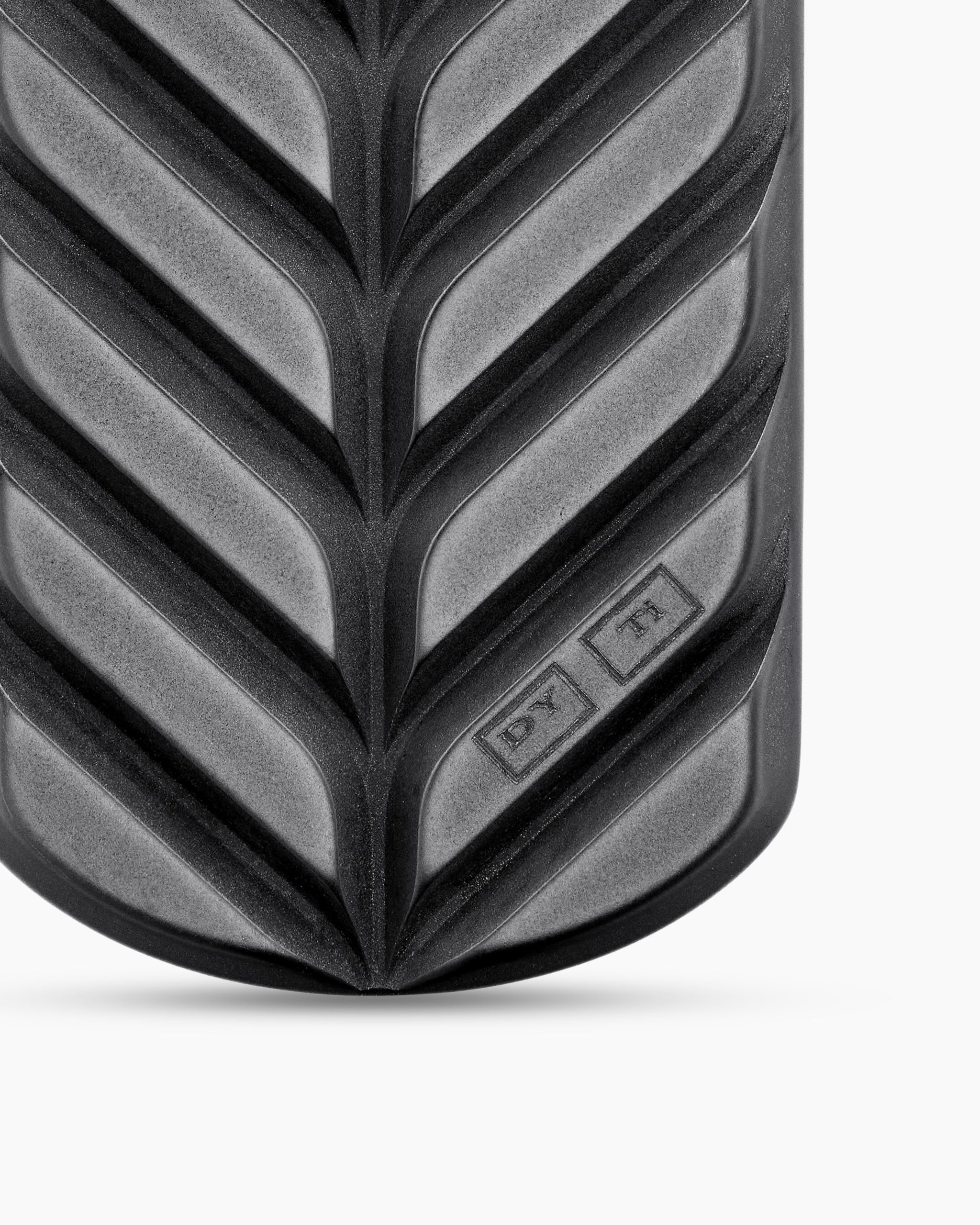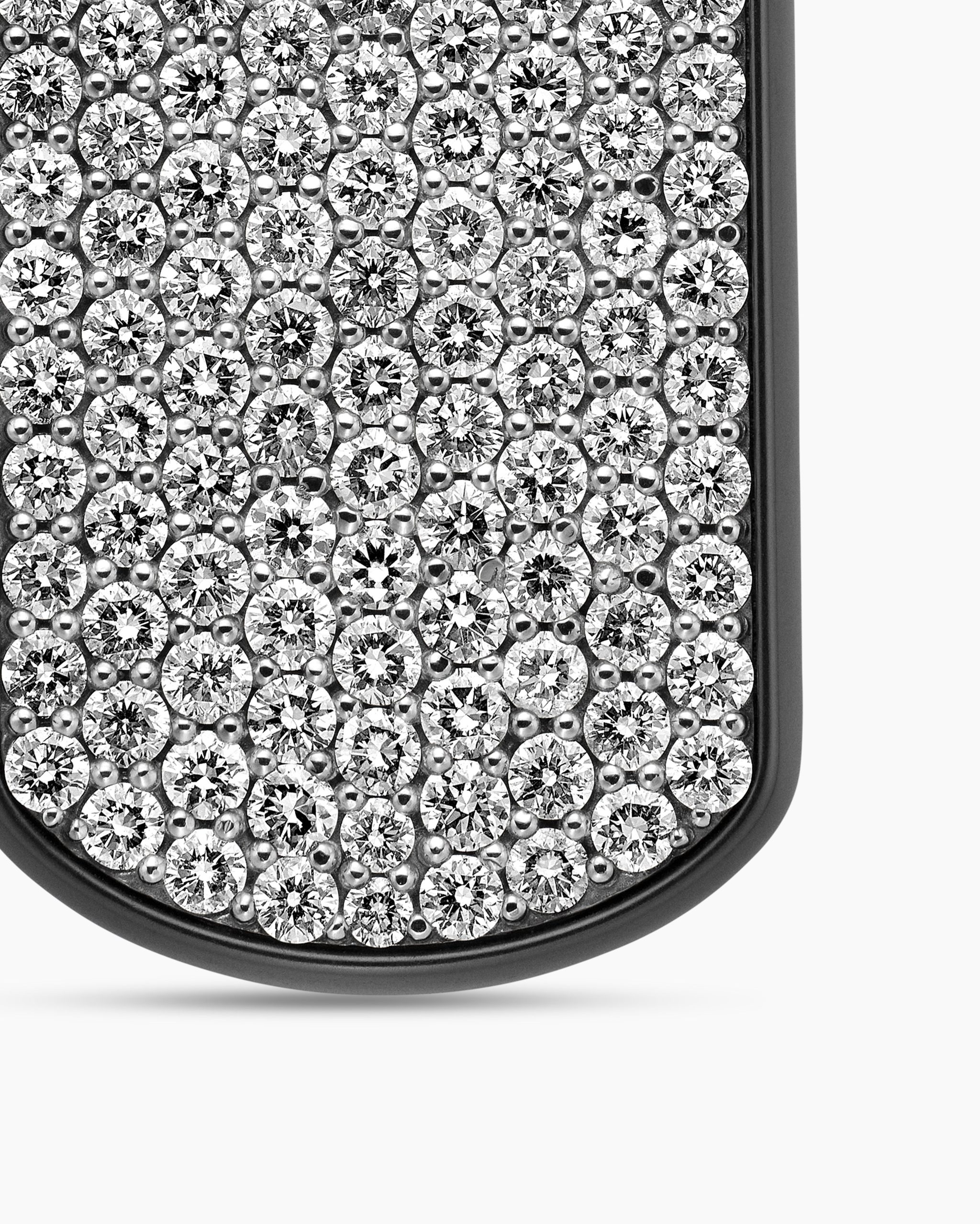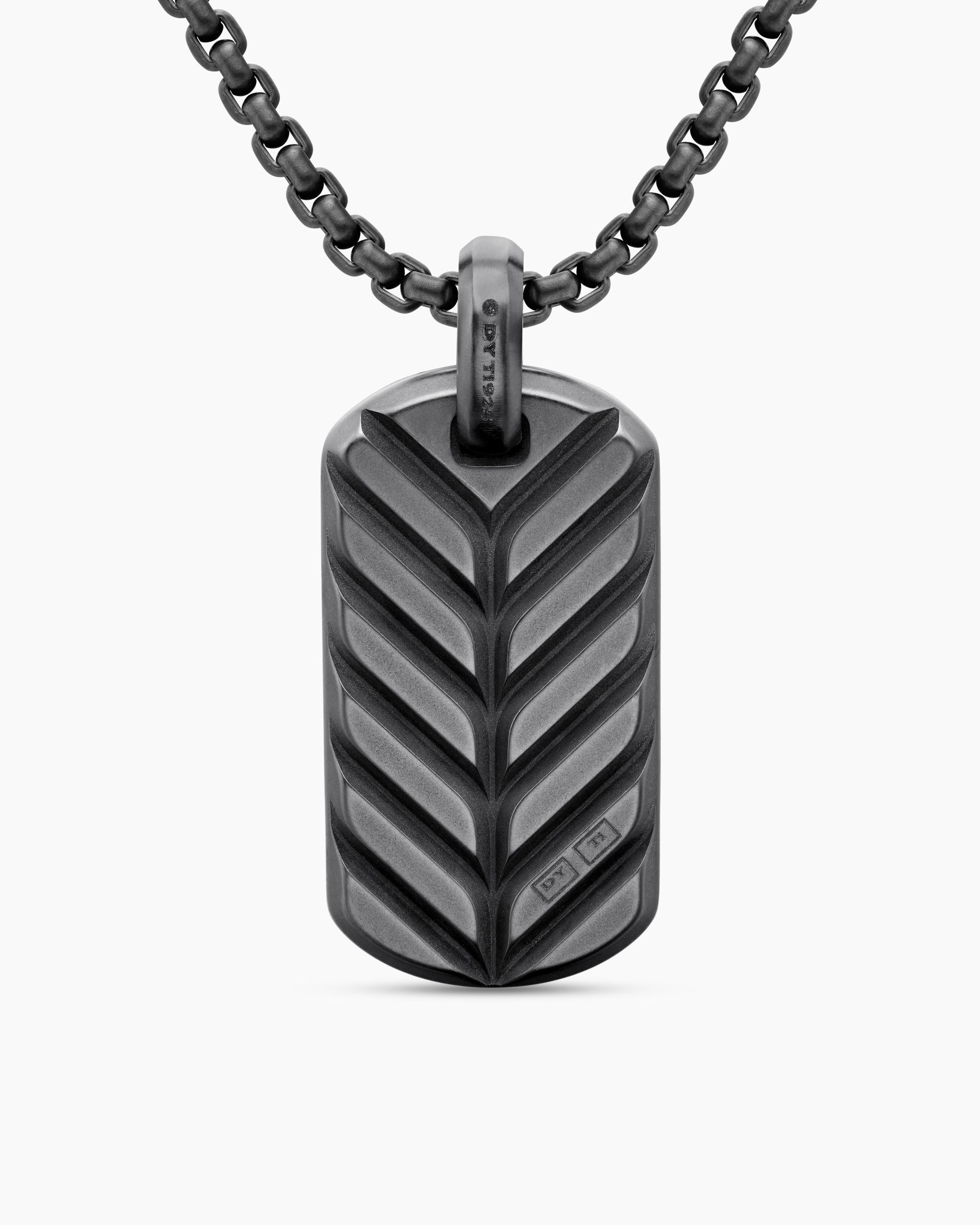 David Yurman skillfully reinterprets chevron—the ancient V-shaped pattern used in architecture and art—in this modern, sculptural collection. Viewed in relation to one another, each half of the motif is a mirror image of Cable. Every pavé diamond or colored gemstone is carefully matched for color and hand set—a tribute to DY artistry. Black titanium with sterling silverPavé diamonds, 3.26 total carat weightTag, 35 x 18.5mmPlease note: tag only; chain sold separatelyShown with: Box Chain