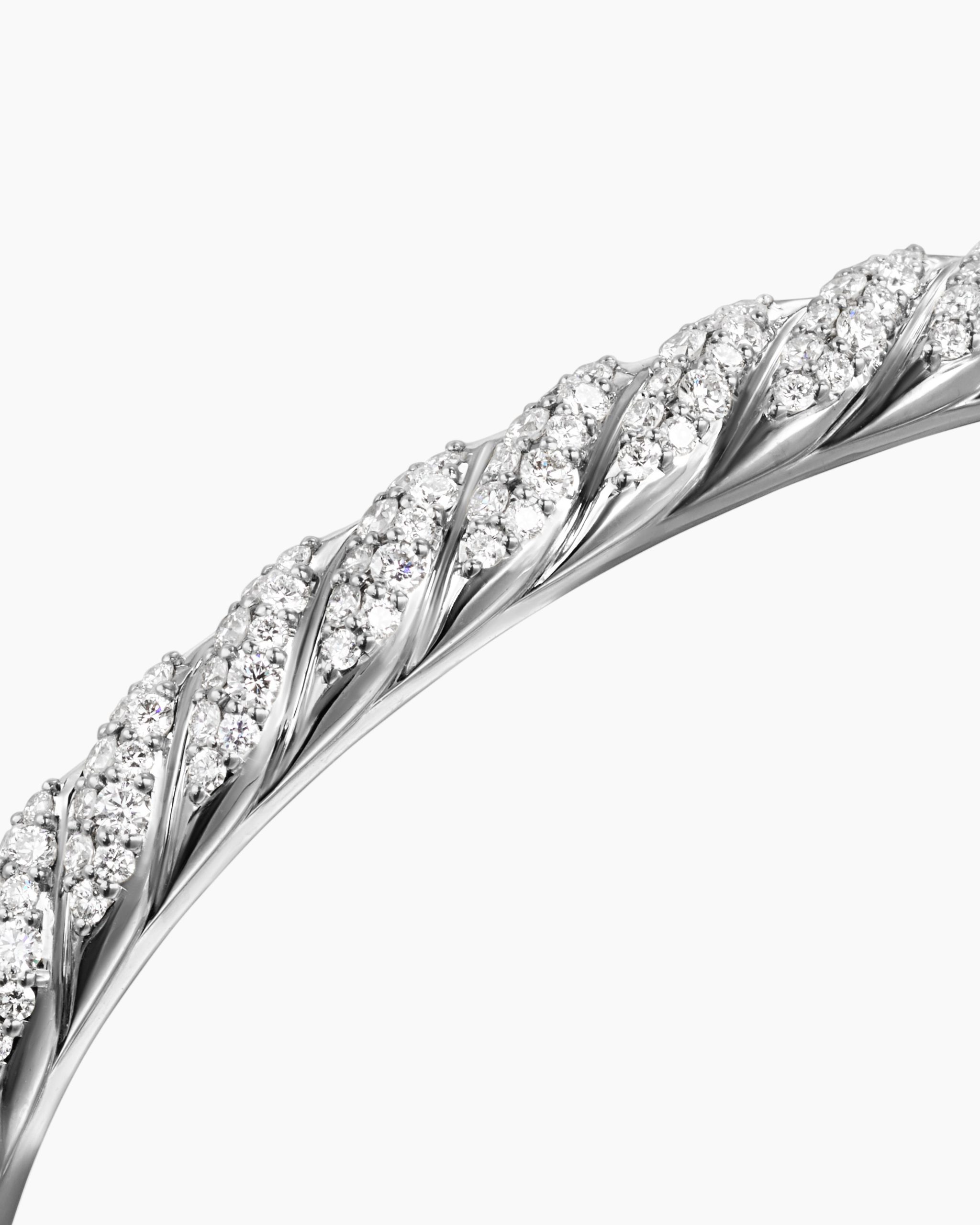 Inspired by his love of architecture and bas-relief sculpture, Evan Yurman designed this modern form by deconstructing Cable—the house’s signature motif—to its essence. Each timeless design is a wearable work of art. Precious metals are meticulously carved with mesmerizing wavelike patterns that dramatically catch the light. Elegant curves highlight the sensuality of the body.18-karat white goldPavé-set diamonds, total carat weight ranges from 1.39 to 1.77 (dependent on size)Bracelet, 5.5mmHinge opening