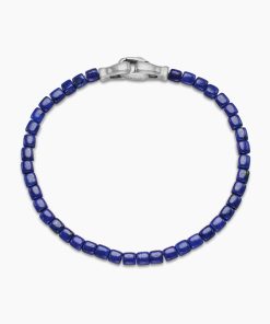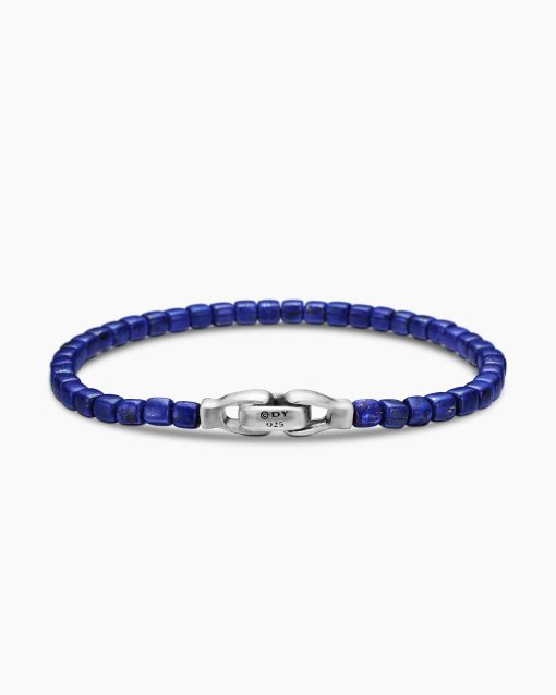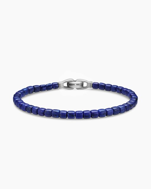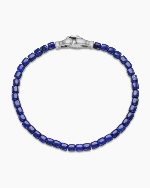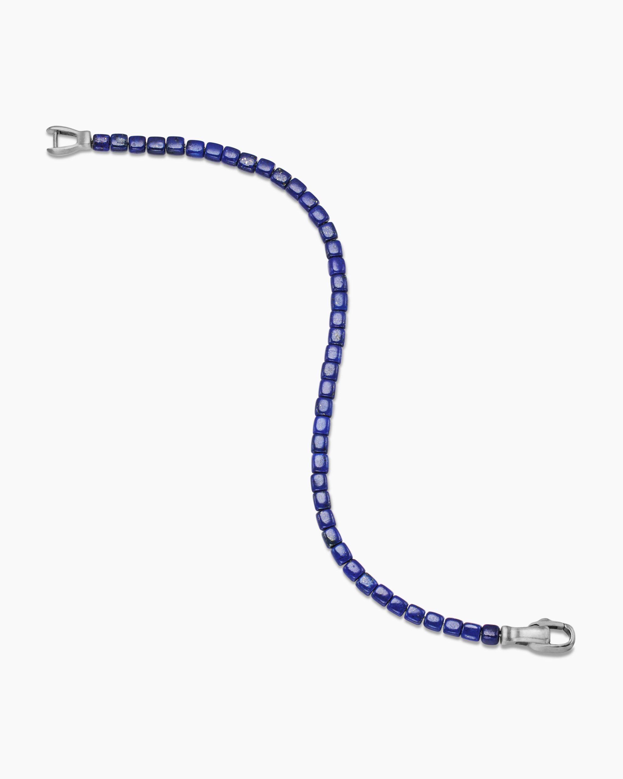 Rooted in spiritual significance, these modern beaded jewelry designs are symbolic of your inner spirit and authenticity. They are meant to be collected, layered, and worn continuously as you move through life’s journey. Expertly crafted, they feature a variety of smoothly polished, semi-precious, and rare gemstones, such as quartz, black onyx and tiger’s eye.Sterling silverLapis lazuliBracelet, 4mmPush clasp