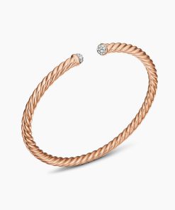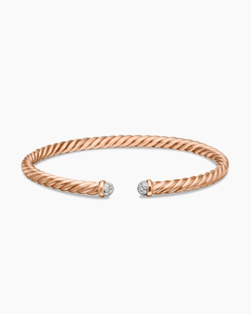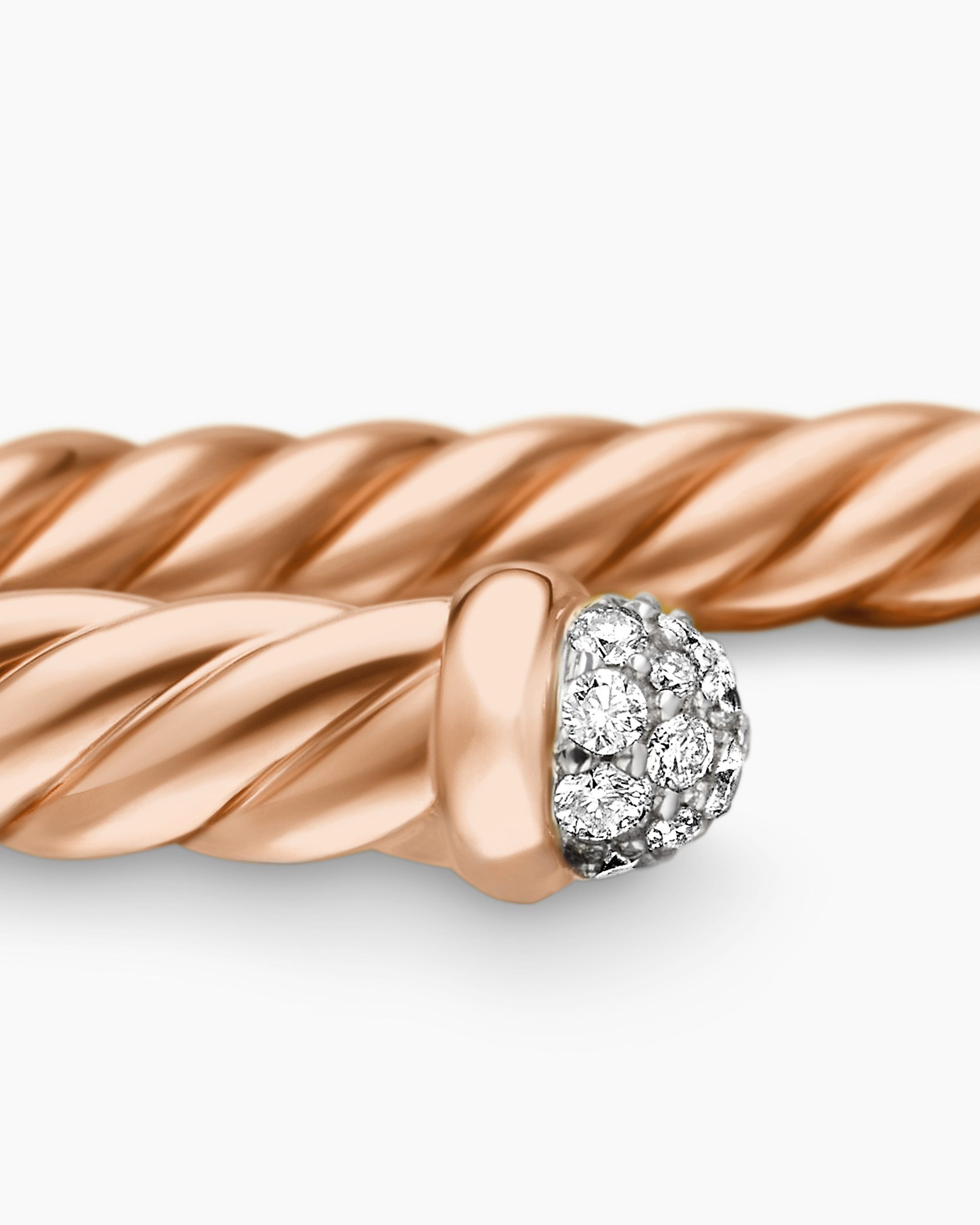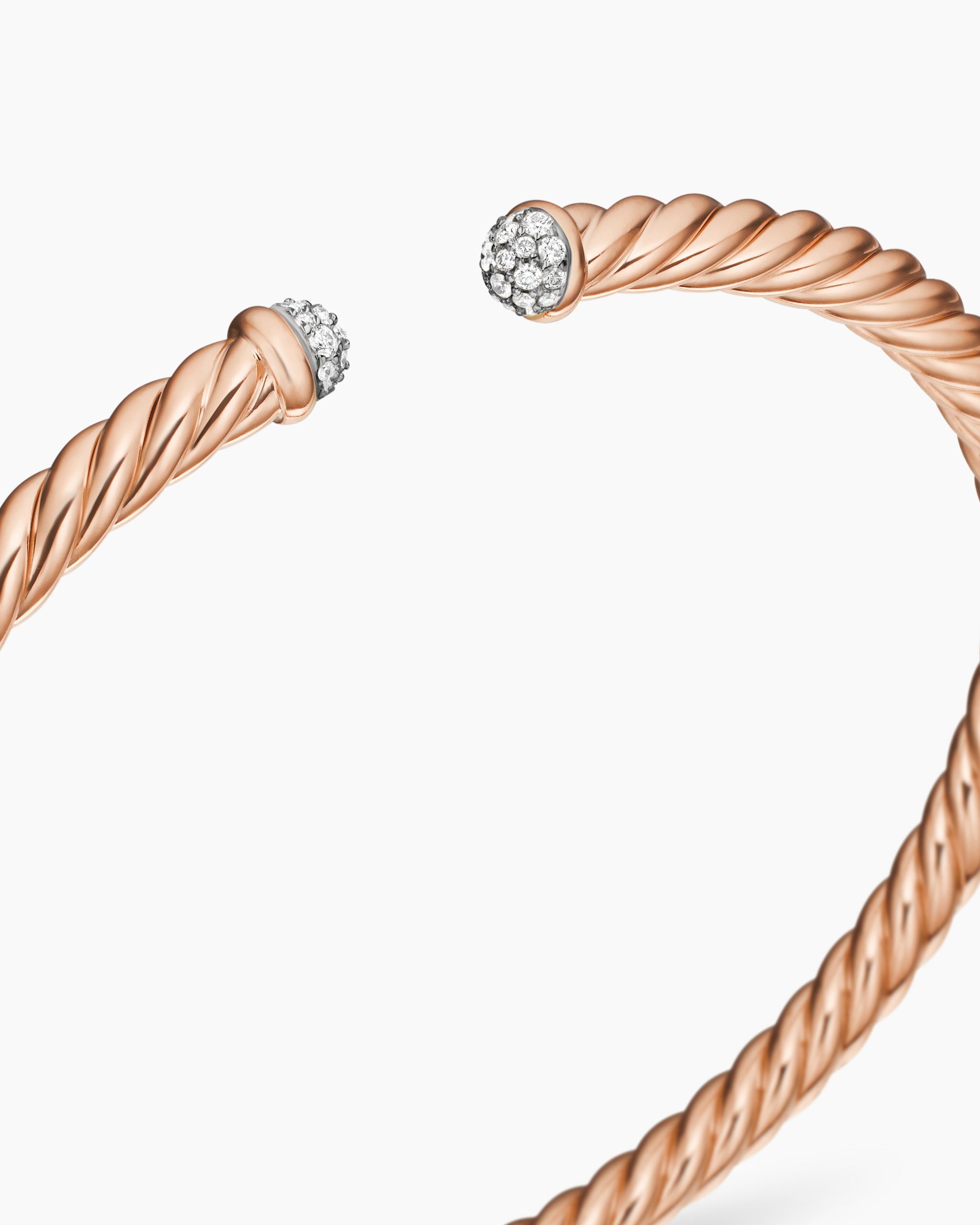 David Yurman’s artistic signature, Cable began as a bracelet that he hand-twisted from 50 feet of wire. For the past 30 years, he has evolved the twisted helix into a myriad of designs. Cablespira® unites artistry and innovation with our exclusive, highly flexible. construction. 18-karat rose goldPavé diamonds, 0.19 total carat weightBracelet, 4mmCablespira® is a patented DY construction that is highly flexible and exceptionally comfortable to wear.