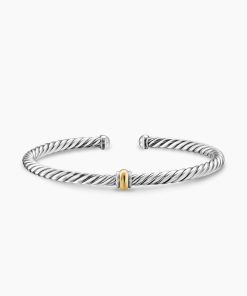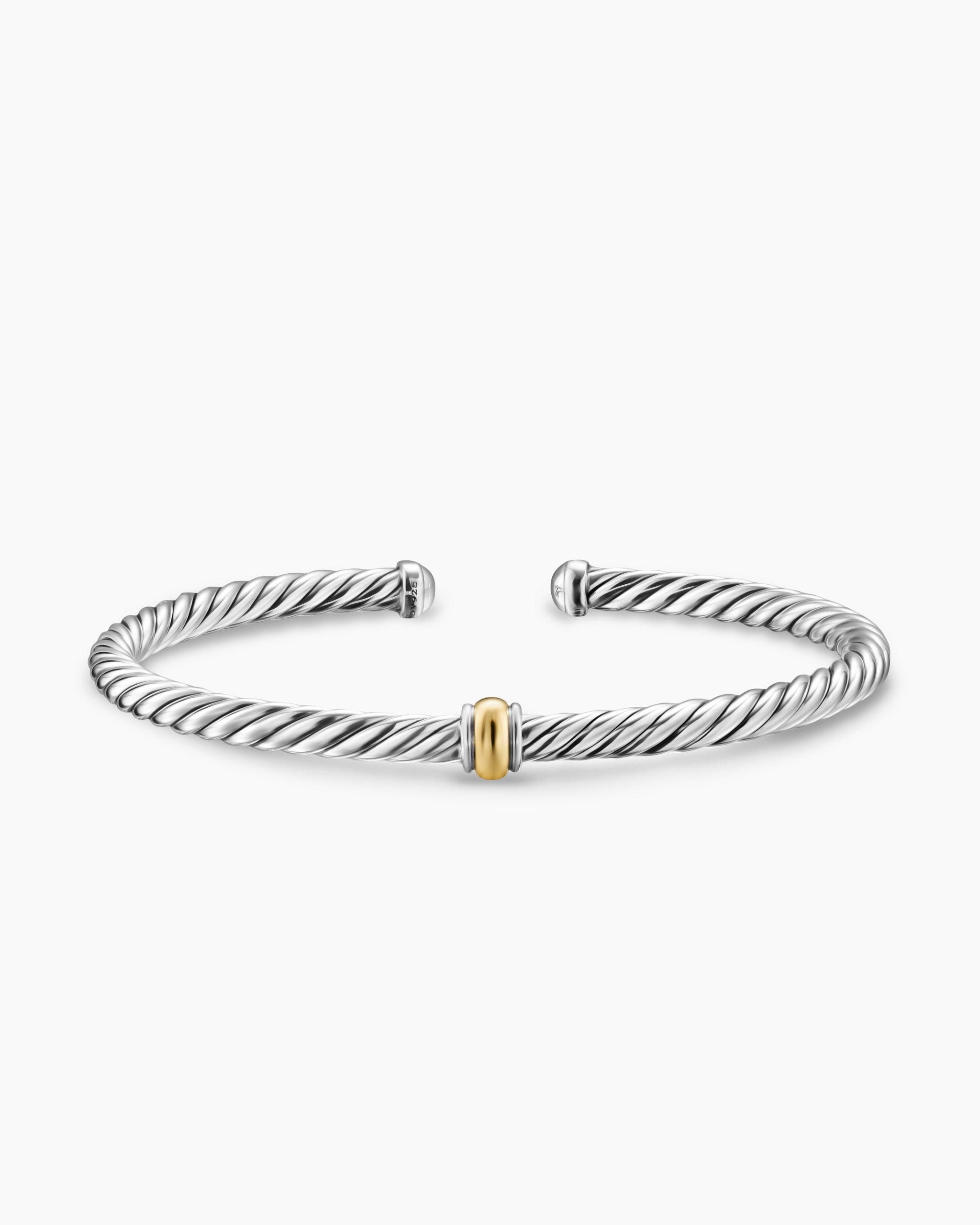 David Yurman’s artistic signature, Cable began as a bracelet that he hand-twisted from 50 feet of wire. For the past 30 years, he has evolved the twisted helix into a myriad of designs.Sterling silver and 14-karat bonded yellow goldBracelet, 4mmNitinol core to provide flex movement.