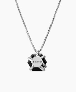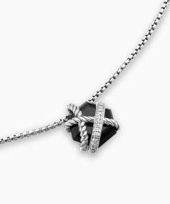 The Cable Wrap Collection redefines how a gemstone is set. Instead of using prongs or a bezel to hold the stone in place, it is elegantly wrapped with strands of Cable and diamonds. Sterling silverBlack onyx, 10mmPavé diamonds, 0.03 total carat weightAdjustable length, 16-17inPendant, 12.5 x 11.5mmChain, 1.25mmLobster clasp