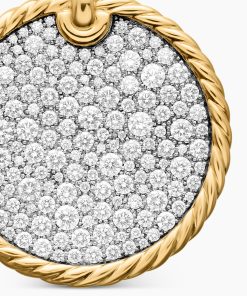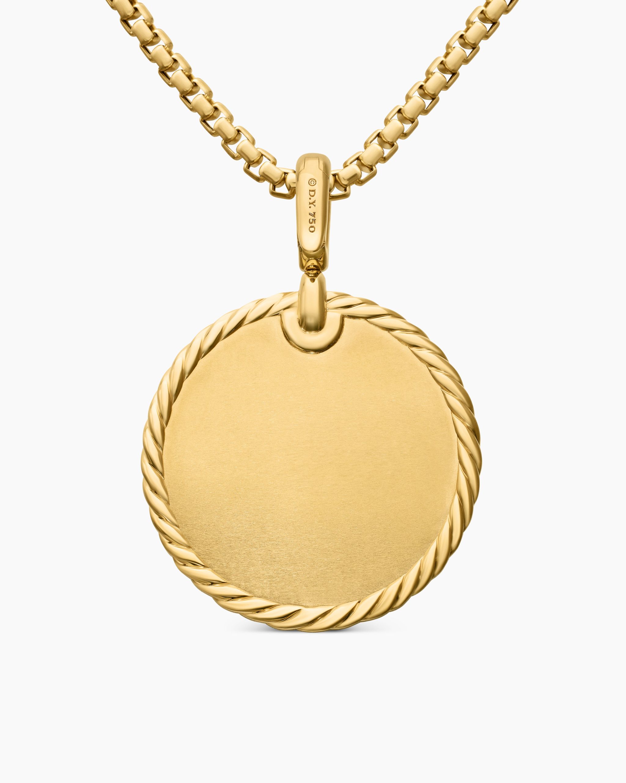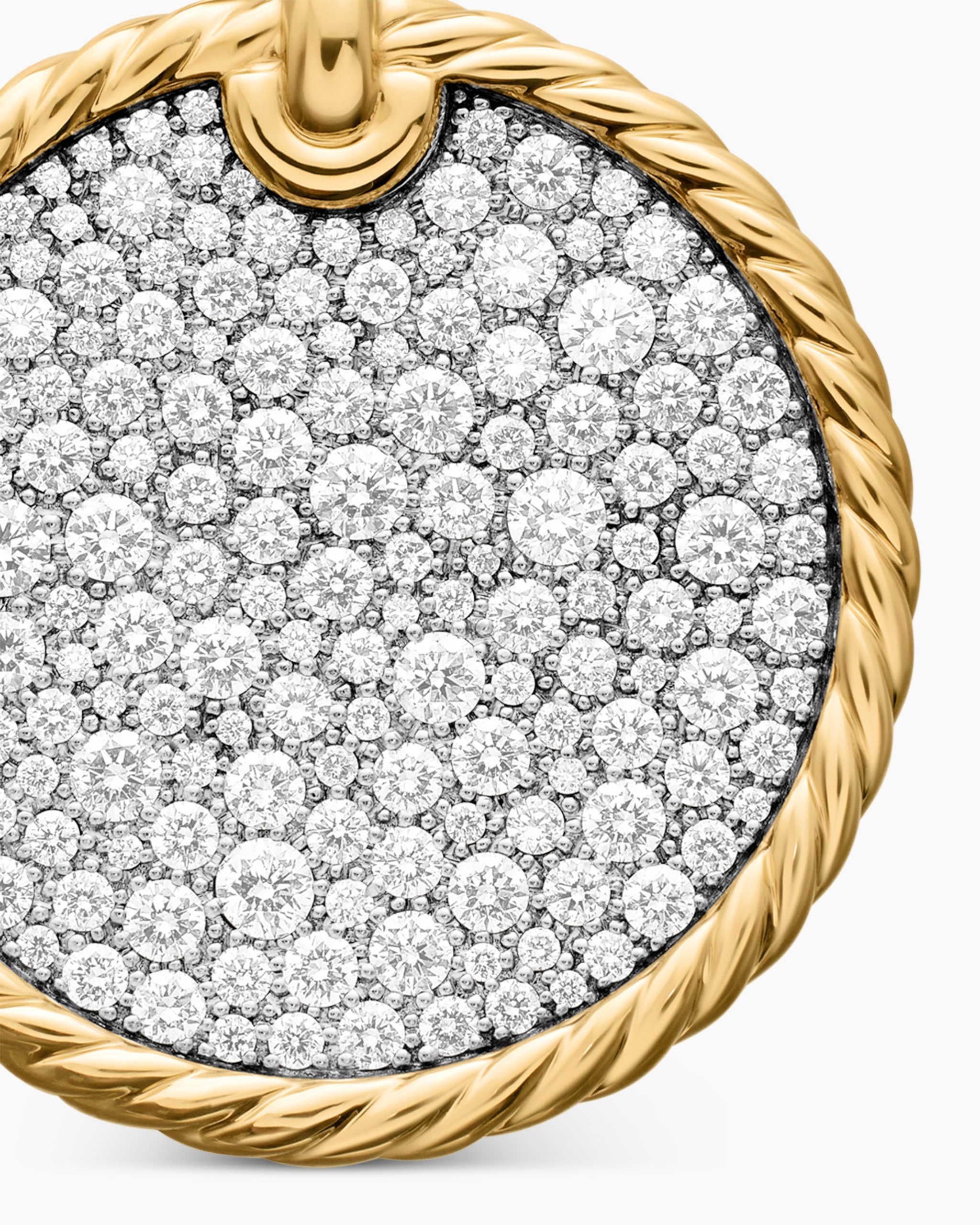 In this collection, David Yurman explores the circle—a timeless symbol of unity, a shape without beginning or end. 18-karat yellow goldPavé diamonds, 2.00 total carat weightPendant, 24mmFunctioning bail allows pendant to attach to a necklace or bracelet.Please note: pendant only; chain sold separatelyShown with: Box Chain