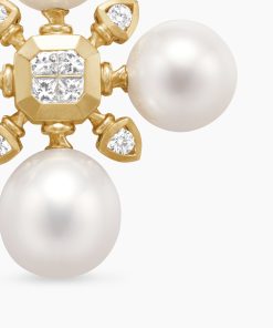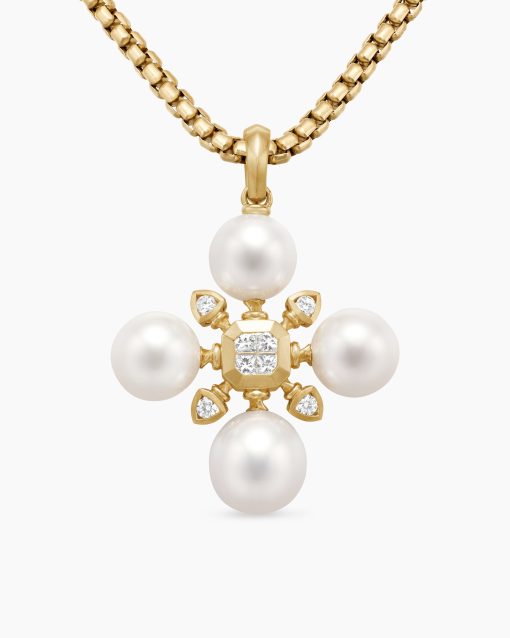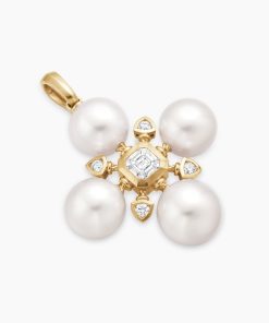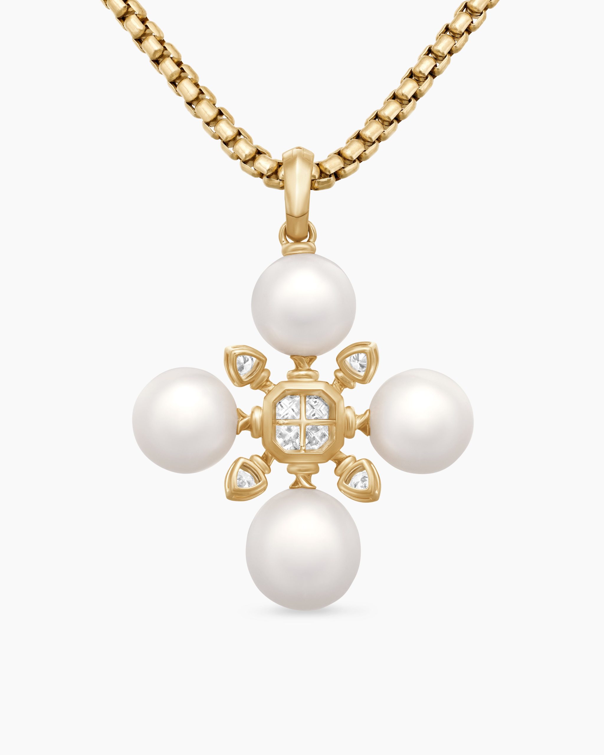 Referencing the art and architecture of the Renaissance period in Europe, this elegant piece combines the quatrefoil motif—long a part of David’s design vocabulary—with the iridescent glow of pearls. 18-karat yellow goldCultured south sea white pearls, 13-15mmDiamonds, 0.87 total carat weightPendant, 55.4 x 40.5mmFunctioning bail allows pendant to attach to a necklace or bracelet.Please note: pendant only; chain sold separatelyShown with: Box Chain