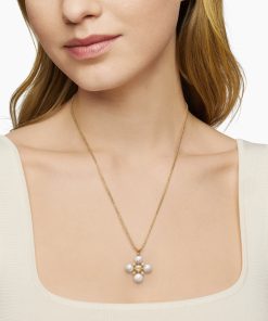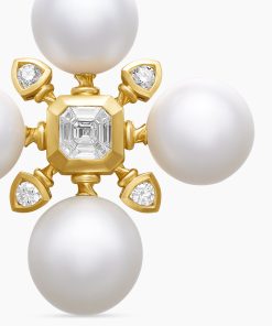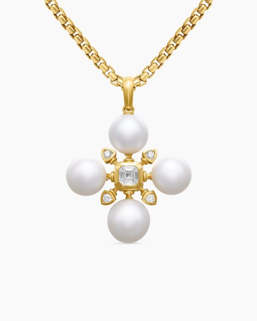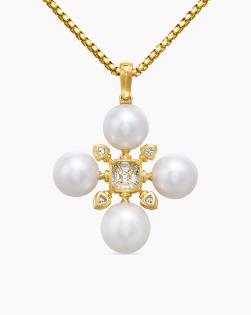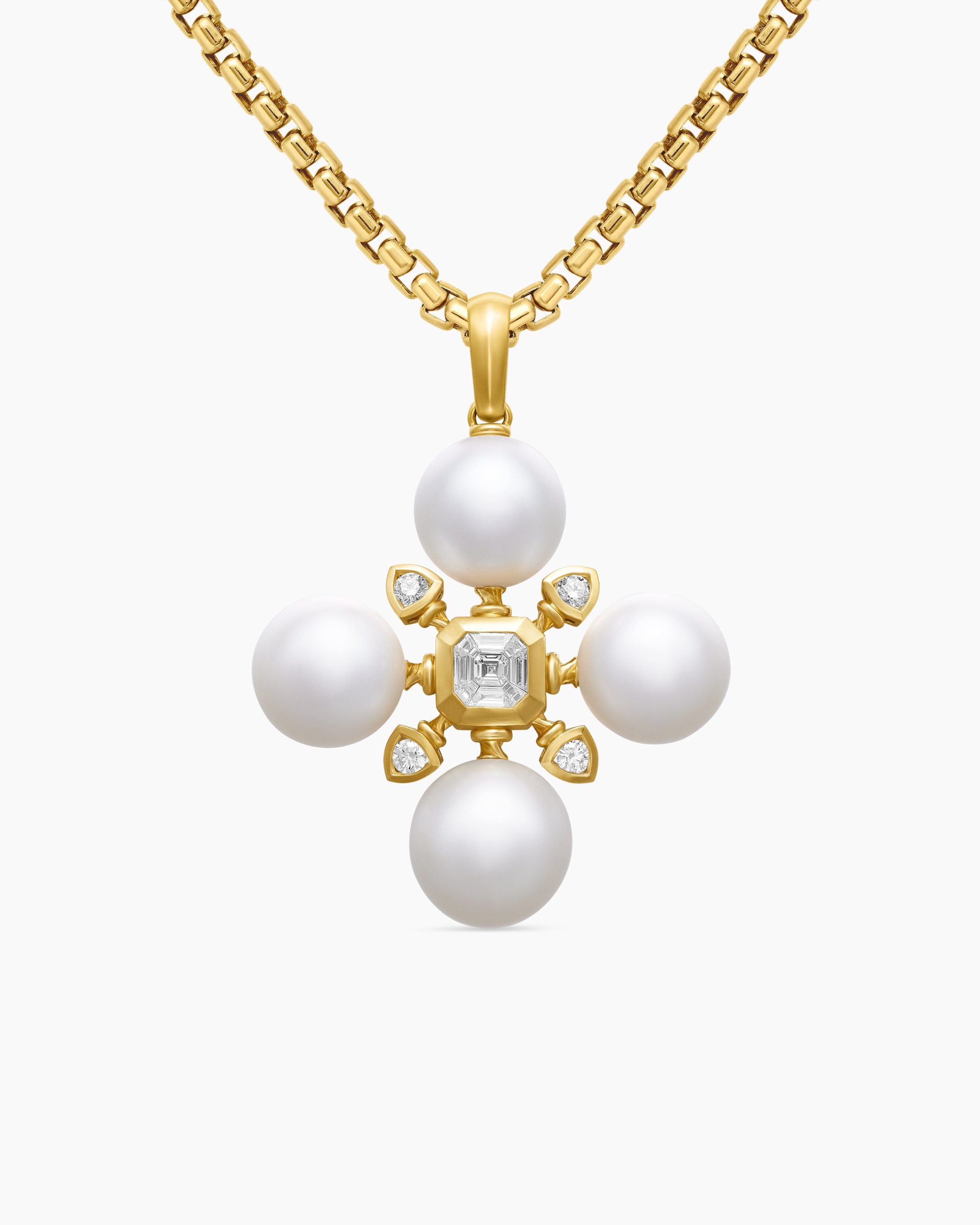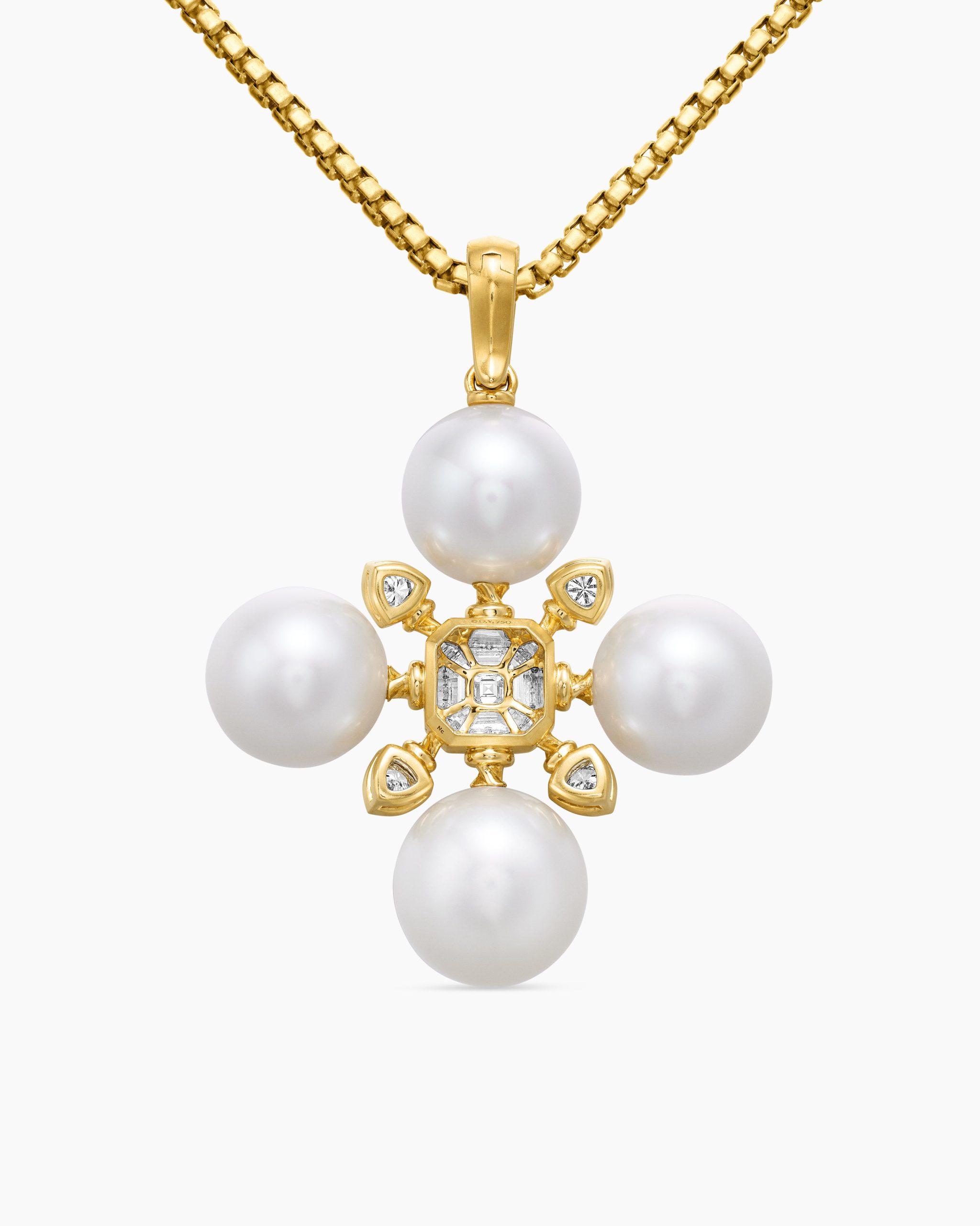 Referencing the art and architecture of the Renaissance period in Europe, this elegant piece combines the quatrefoil motif—long a part of David’s design vocabulary—with the iridescent glow of pearls. 18-karat yellow goldCultured south sea white pearls, 8-9.5mmDiamonds, 0.36 total carat weightPendant, 37.5 x 27.4mmFunctioning bail allows pendant to attach to a necklace or bracelet.Please note: pendant only; chain sold separatelyShown with: Box Chain