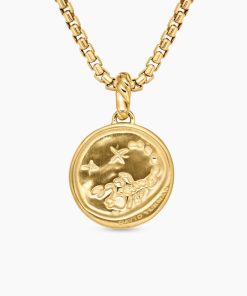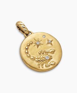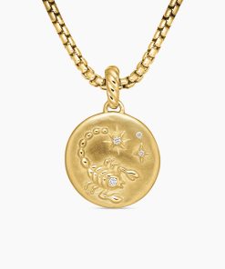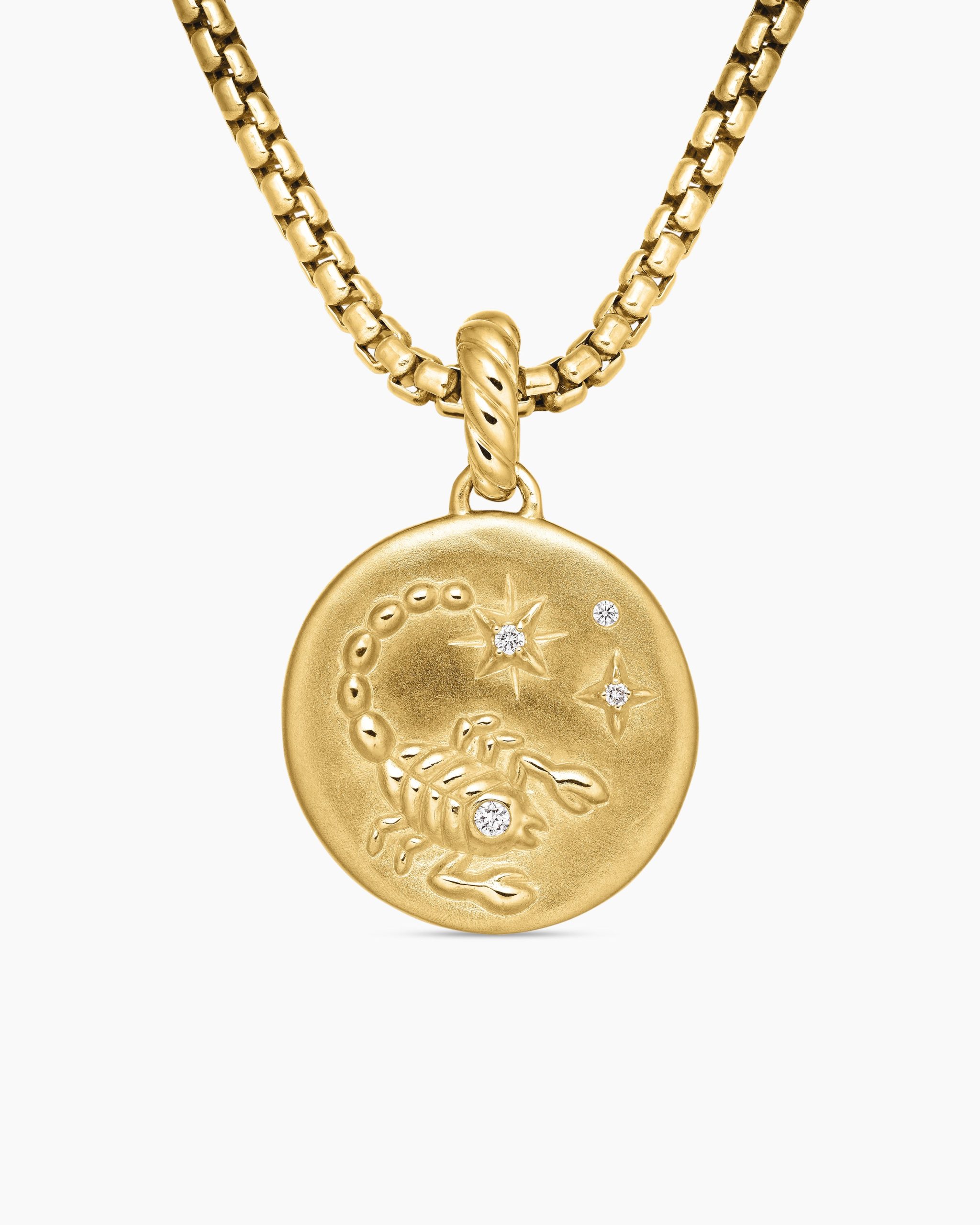 SCORPIO October 24–November 21Symbol: ScorpionPowerful, strong, independent 18-karat yellow gold Diamonds, 0.04 total carat weightAmulet, 27.4 x 19.2mmFunctioning bail allows pendant to attach to a necklace or bracelet.Please note: amulet only; chain sold separately.Shown with: Box Chain
