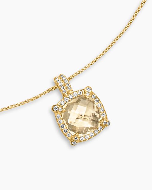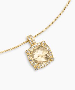 The Châtelaine® Collection is a perfect fusion of David and Sybil Yurman’s combined art—the marriage of a sculptor and a painter—form and color. 18-karat yellow goldChampagne citrine, 2.75 total carat weightStone, 9mmPavé diamonds, 0.18 total carat weightAdjustable length, 17-18inPendant, 12.1mmChain, 1.0mmLobster claspFunctioning bail allows pendant to attach to a necklace or bracelet.