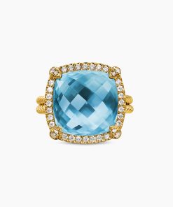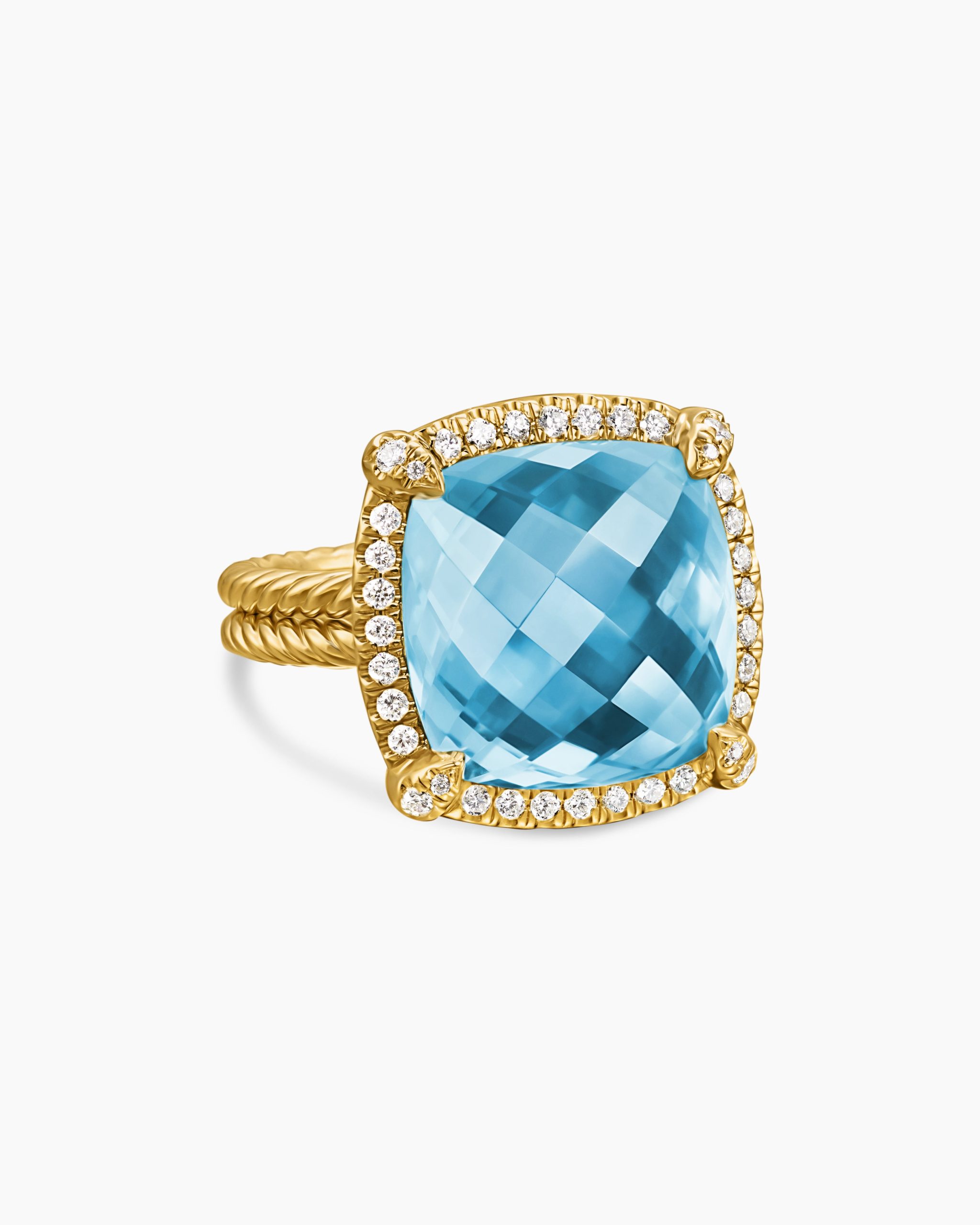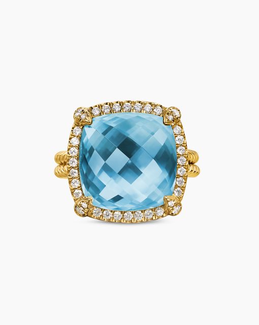 The Châtelaine® Collection is a perfect fusion of David and Sybil Yurman’s combined art—the marriage of a sculptor and a painter—form and color. 18-karat yellow gold Blue topaz, 12.25 total carat weightStone, 14mmPavé-set diamonds, 0.30 total carat weightRing, 18mm