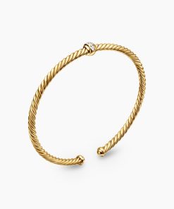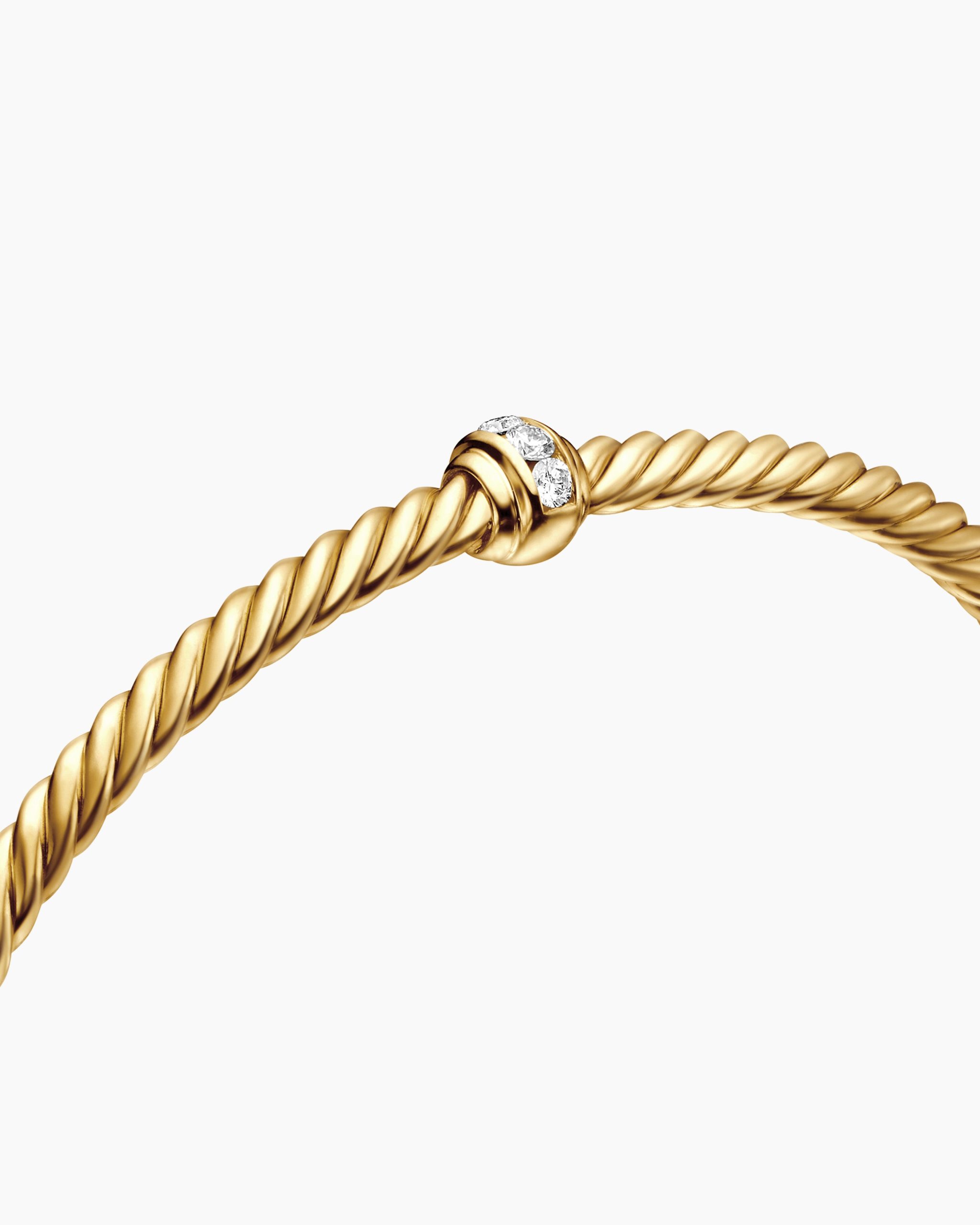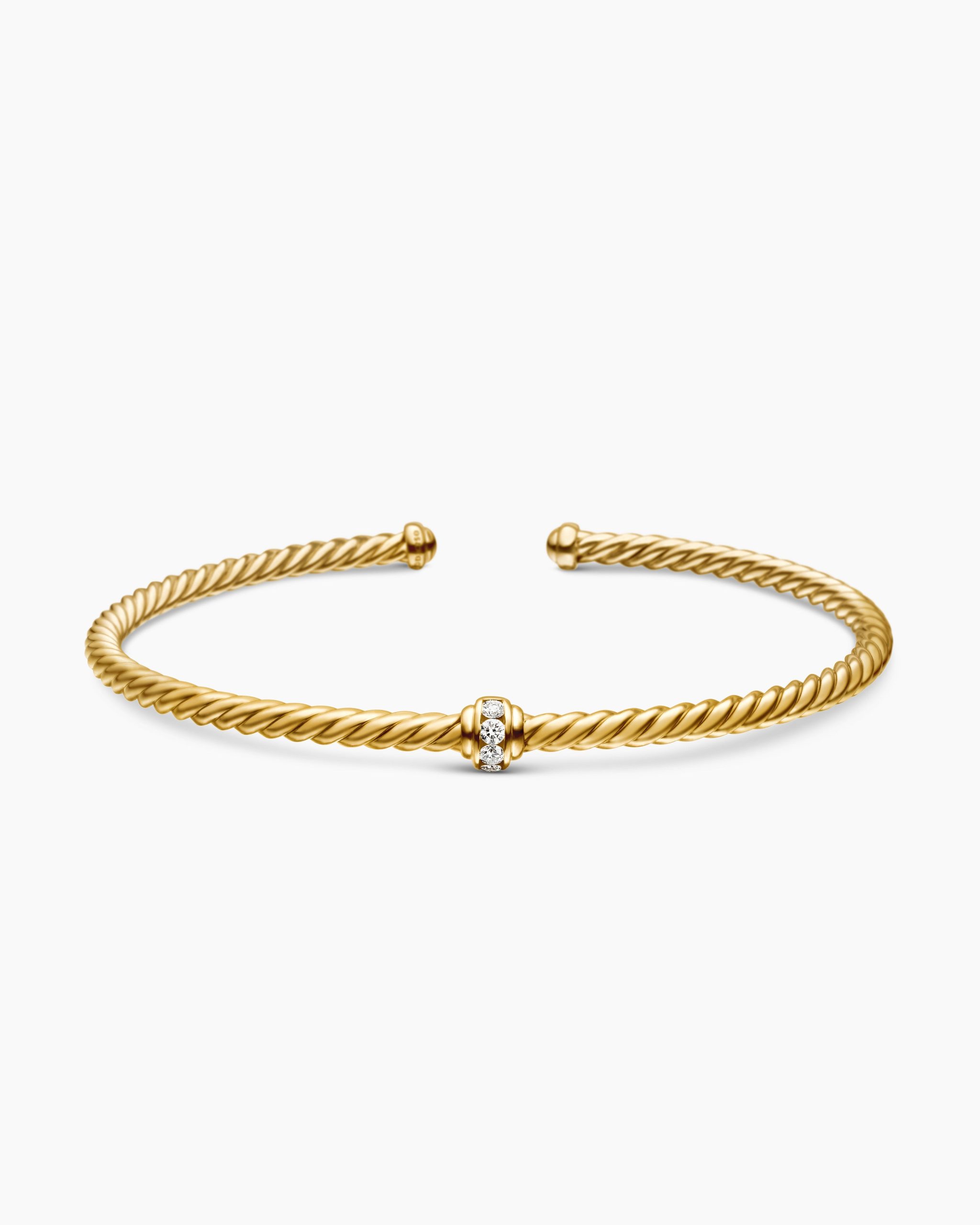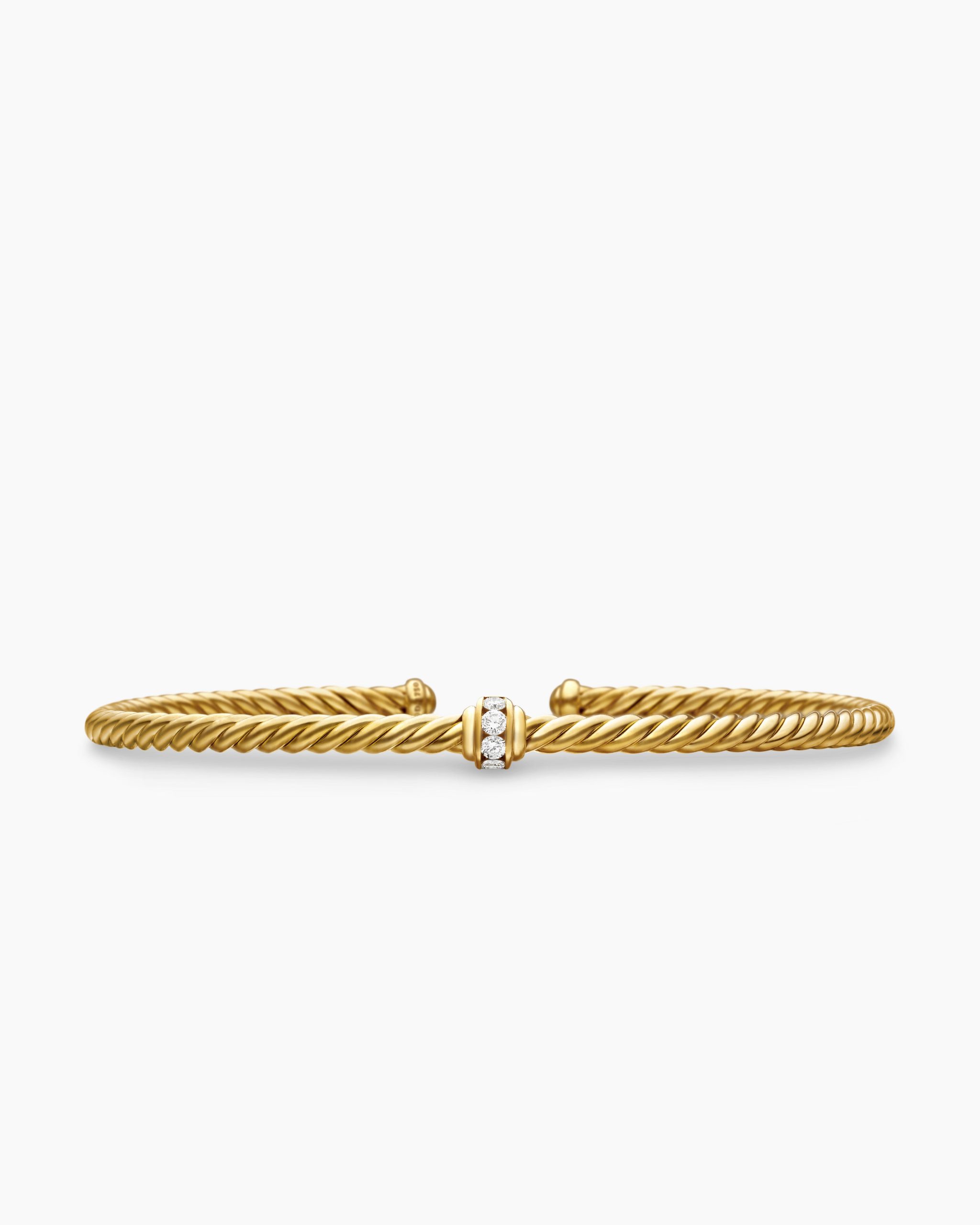 David Yurman’s artistic signature, Cable began as a bracelet that he hand-twisted from 50 feet of wire. For the past 30 years, he has evolved the twisted helix into a myriad of designs. 18-karat yellow goldPavé diamonds, 0.09 total carat weightBracelet, 3mmCablespira® is a patented DY construction that is highly flexible and exceptionally comfortable to wear.