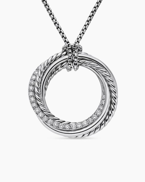 The Crossover Collection® explores the rhythmic weaving of line to create form and movement. Using a dynamic range of smooth and cabled cords, the individual strands are meticulously entwined. Sterling silverPavé diamonds, 0.60 total carat weightTotal length, 36inPendant, 26mmChain, 1.7mmSlider clasp