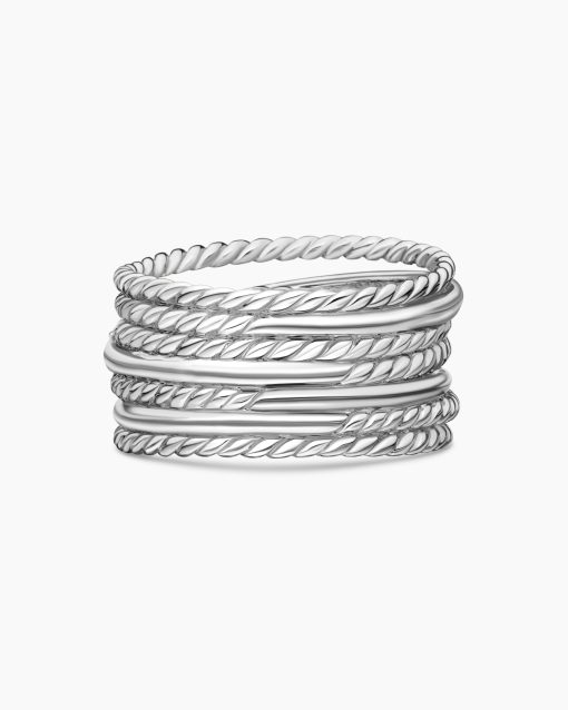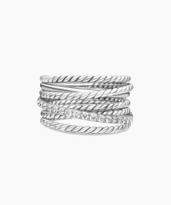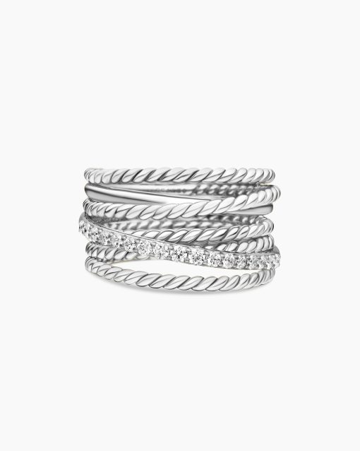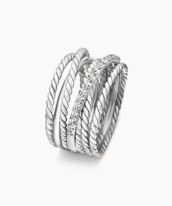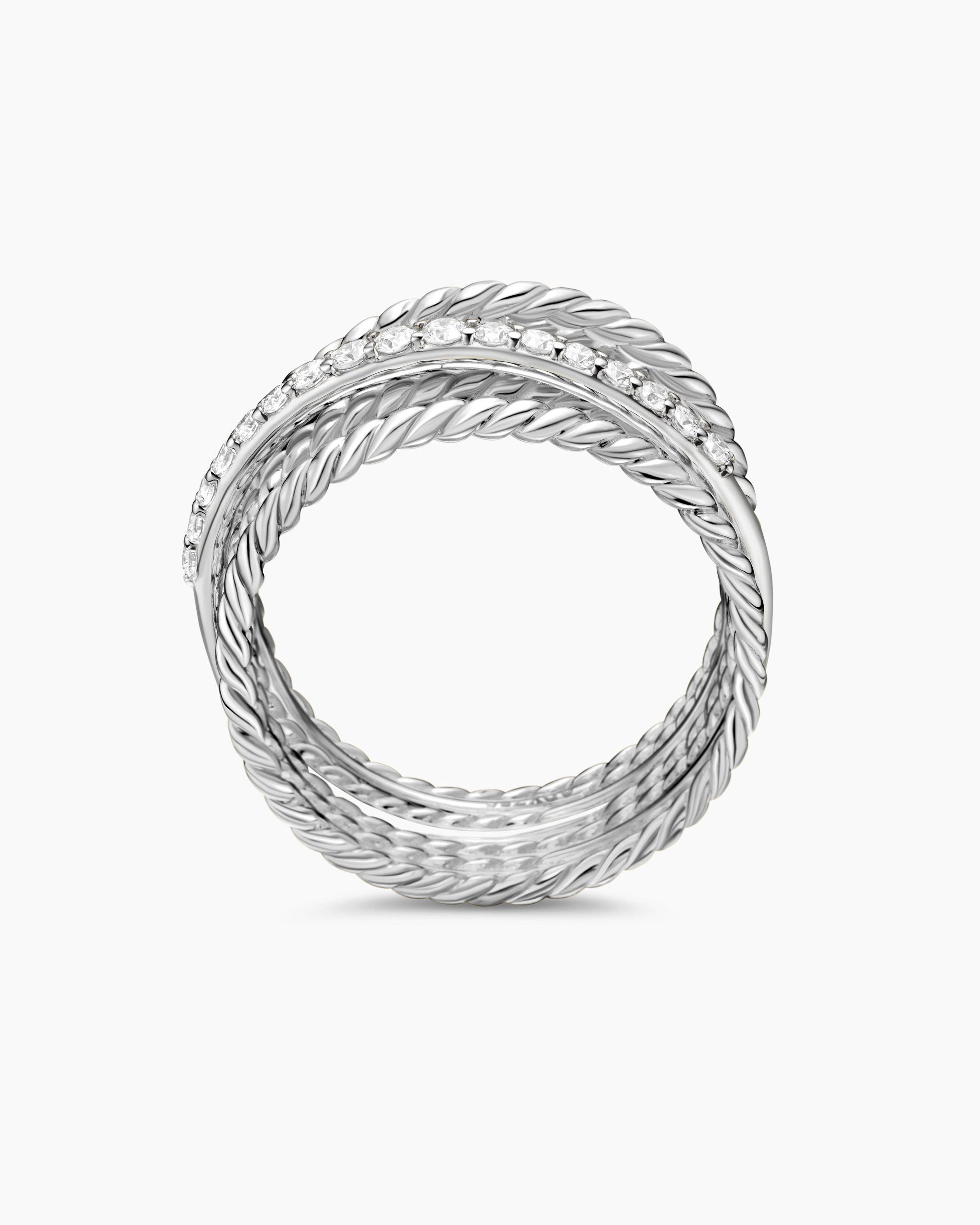 The Crossover Collection® explores the rhythmic weaving of line to create form and movement. Using a dynamic range of smooth and cabled cords, the individual strands are meticulously entwined. Sterling silverPavé diamonds, 0.18 total carat weightRing, 12mmThis item can be engraved. Please contact customer care for more information.