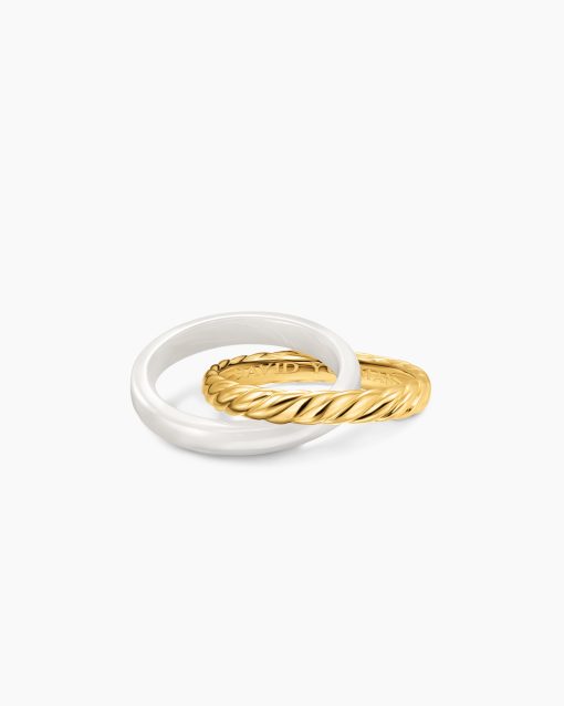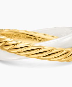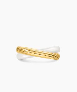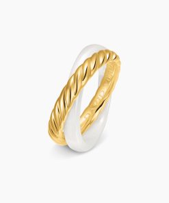 The DY Crossover® Collection explores the rhythmic weaving of line to create form and movement. Using a dynamic range of smooth and cabled cords, the individual strands are meticulously entwined.18-karat yellow goldWhite ceramicRing, 7mmStrands of smooth and Cabled metals intertwine with a dynamic rolling effect, creating a rhythmic weaving of form and movement.