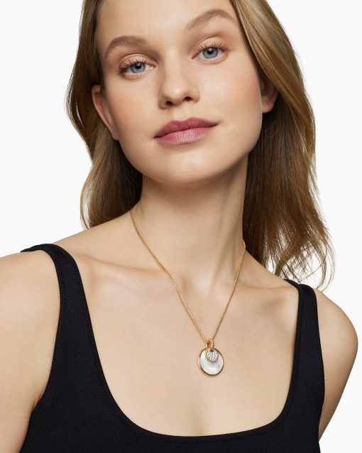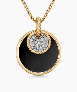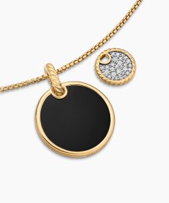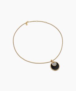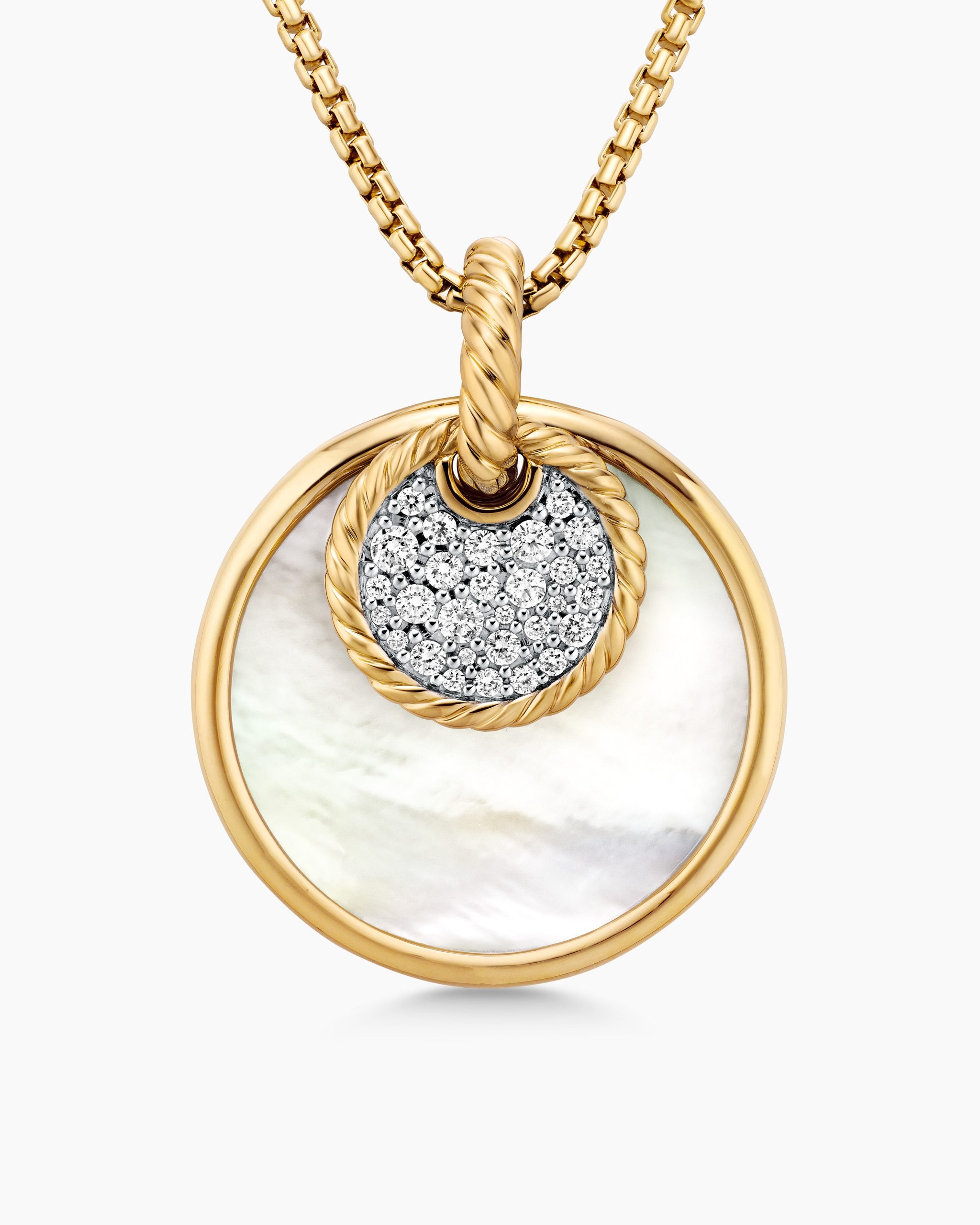 In this collection, David Yurman explores the circle—a timeless symbol of unity, a shape without beginning or end. 18-karat yellow goldBlack onyx and mother of pearl backed with white agatePavé diamonds, 0.34 total carat weightAdjustable length, 16-18inPendant, 26.6mmChain, 1.7mmLobster claspThis necklace is interchangable and can be worn multiple different ways. Elements are removeable and can be worn individually if desired.