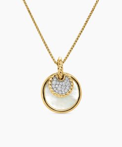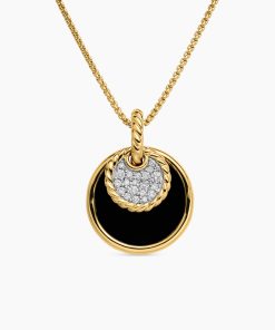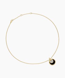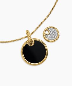 In this collection, David Yurman explores the circle—a timeless symbol of unity, a shape without beginning or end. 18-karat yellow goldBlack onyx and mother of pearl backed with white agatePavé diamonds, 0.12 total carat weightAdjustable length, 15-17inPendant, 21.5 x 16.5mmLobster claspThis necklace is interchangable and can be worn multiple different ways. Elements are removeable and can be worn individually if desired.