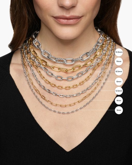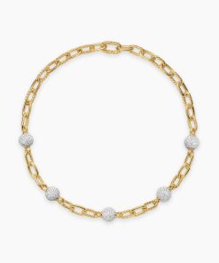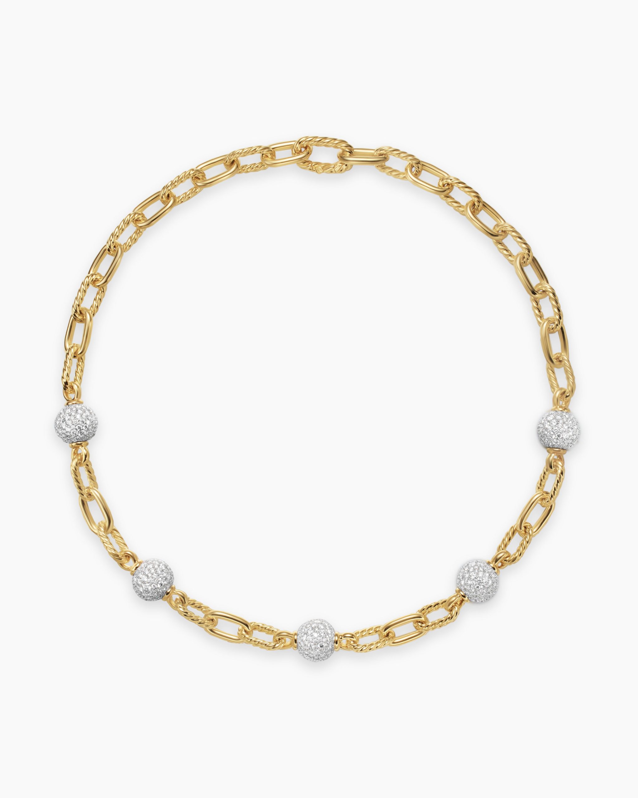 Named for the iconic Manhattan avenue, DY Madison® captures the bold spirit of New York City—unexpected moments and the promise of success. A striking juxtaposition of smooth and Cabled, pillow-shaped links fuses the brand’s signature design elements to create a unique rhythm. At once modern and timeless, these must-have chains are instant heirlooms.18-karat yellow goldPavé-set diamonds, 11.12 total carat weightNecklace, 8.5mmPush clasp