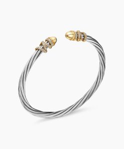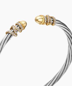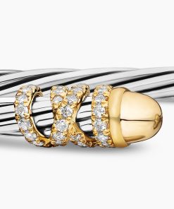 In the Helena Collection, David Yurman returns to the longer, leaner twist of his first handmade Cable bracelet, wrapping the iconic form with 18K yellow gold threads accented with hand-set pavé diamonds. Sterling silver with 18-karat yellow gold18K gold domesPavé diamonds, 0.45 total carat weightBracelet, 4mm