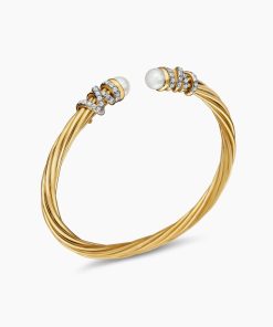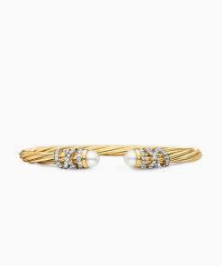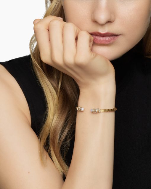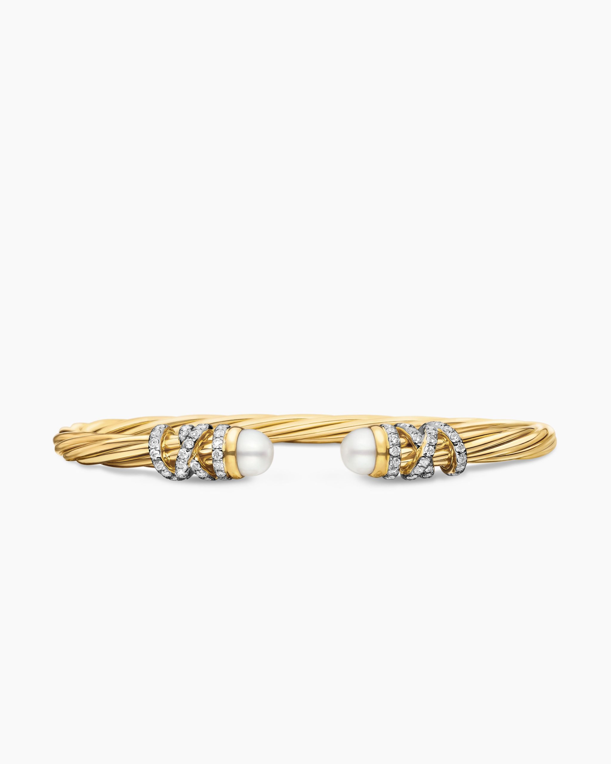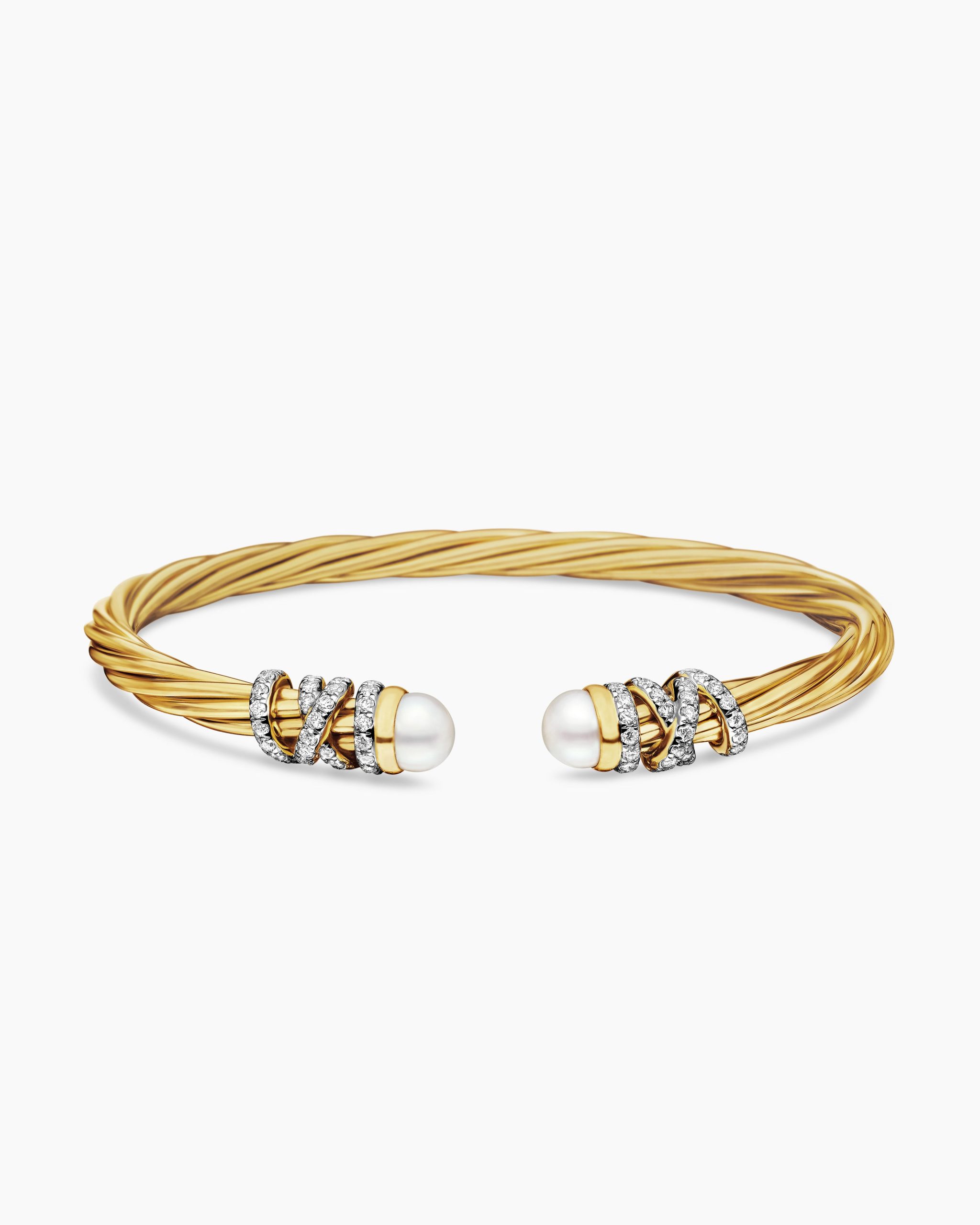 In the Helena Collection, David Yurman returns to the longer, leaner twist of his first handmade Cable bracelet, wrapping the iconic form with 18K yellow gold threads accented with hand-set pavé diamonds. 18-karat yellow goldCultured freshwater pearls, 5-5.5mmPavé diamonds, 0.42 total carat weight Bracelet, 4mm