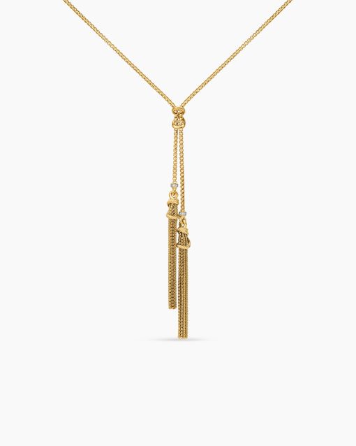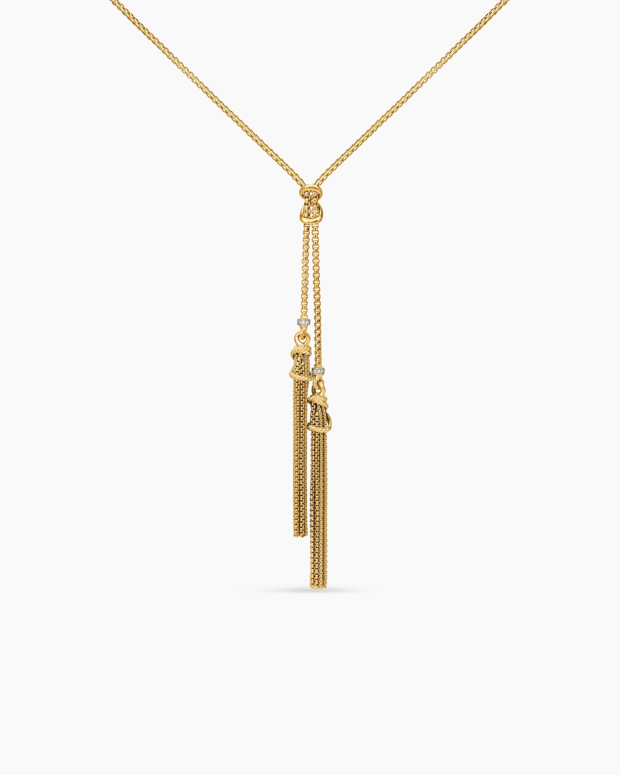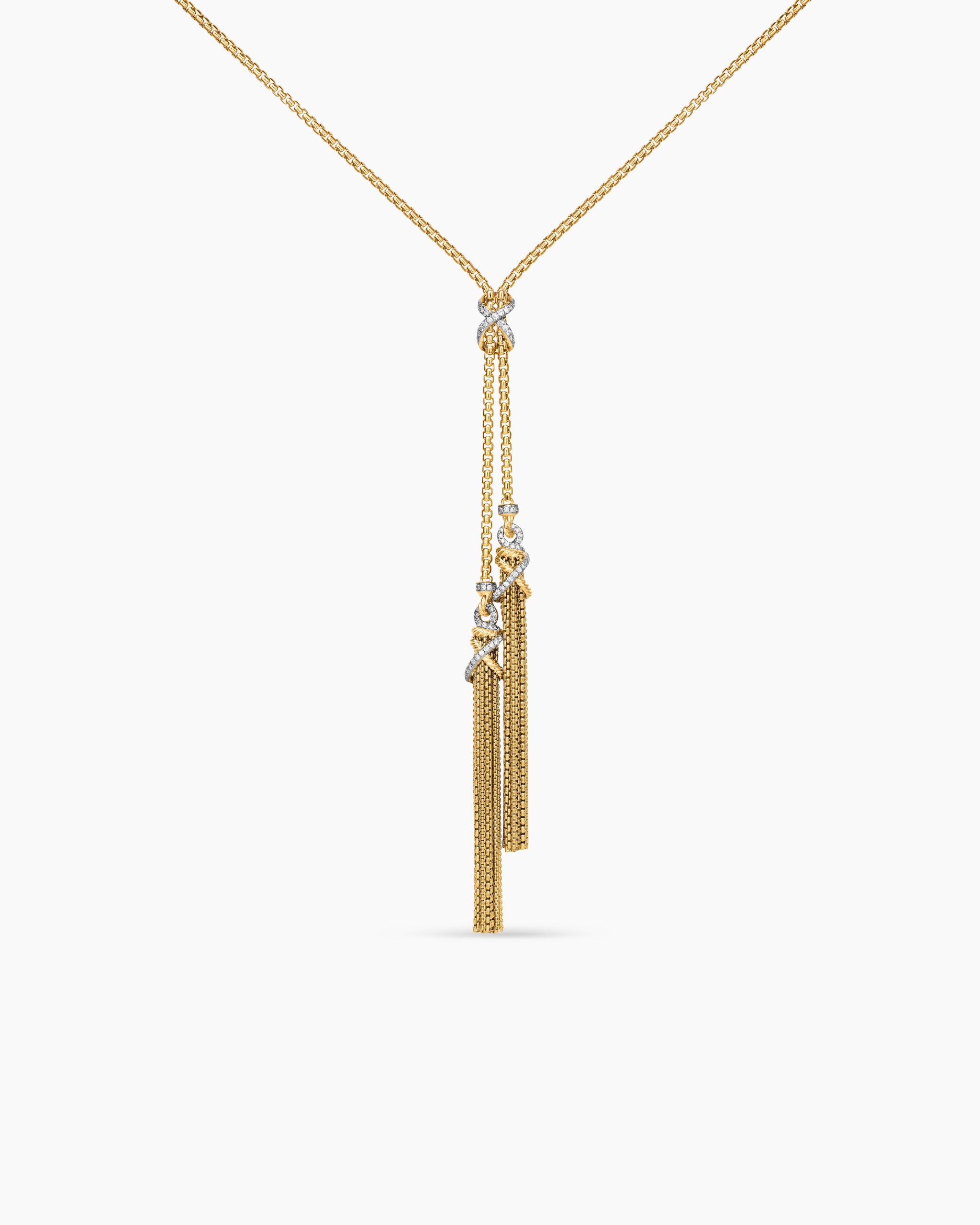 In the Helena Collection, David Yurman returns to the longer, leaner twist of his first handmade Cable bracelet, wrapping the iconic form with 18K yellow gold threads accented with hand-set pavé diamonds. 18-karat yellow gold Pavé diamonds, 0.61 total carat weightAdjustable length, 30inTassel, 2.5inChain, 2.7mmSlider clasp