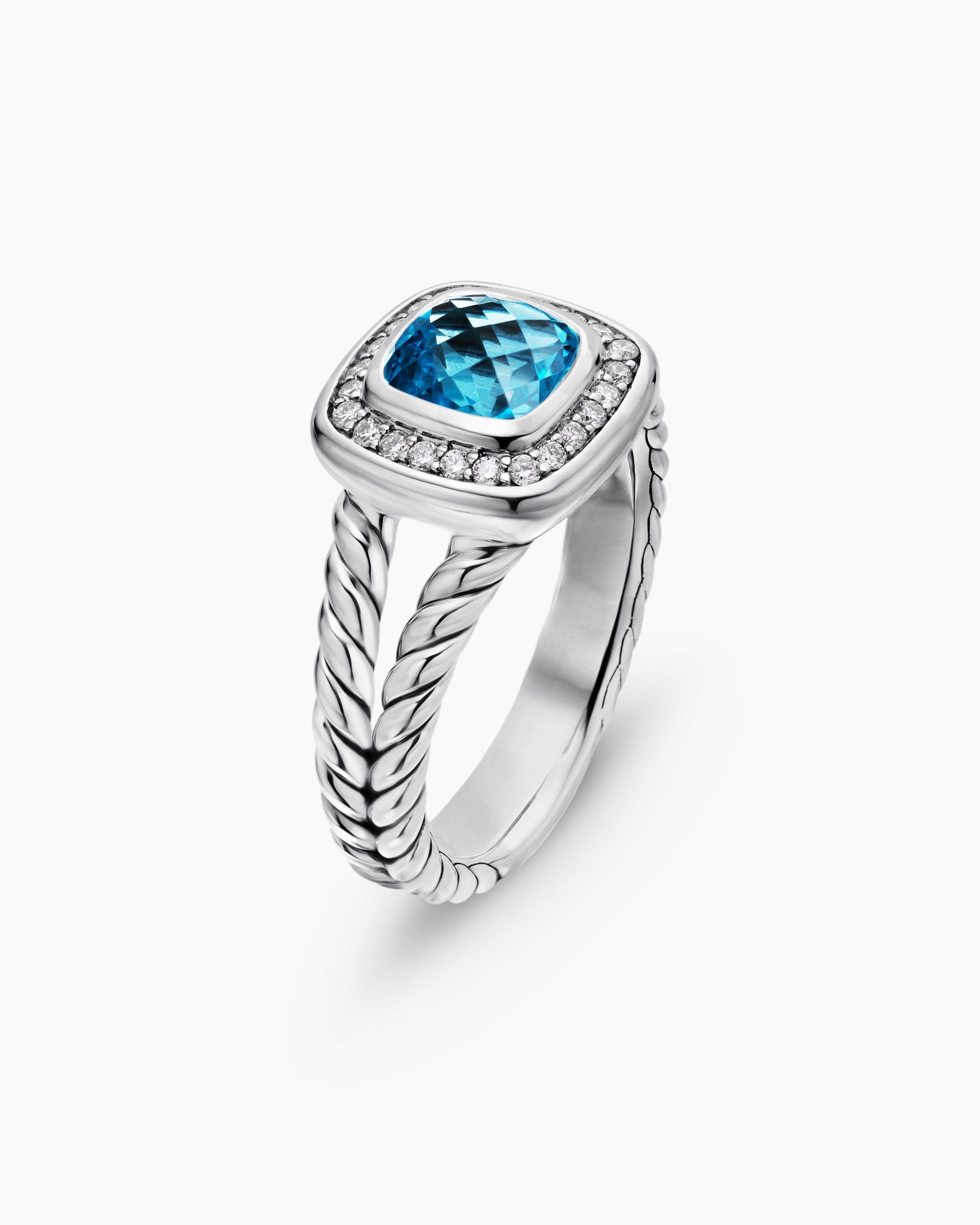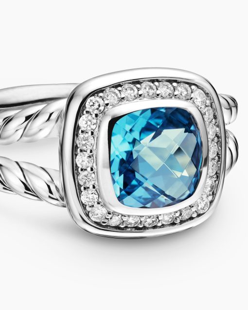 The Albion® Collection’s unique cushion-cut center stone was David Yurman’s innovative solution to use an oversize gemstone in a refined modern setting with classical proportions. Sterling silverBlue topaz, 1.83 total carat weightStone, 7mmPavé diamonds, 0.17 total carat weightRing, 11.8mmThis item can be resized. Please contact customer care for more information.This item can be engraved. Please contact customer care for more information.