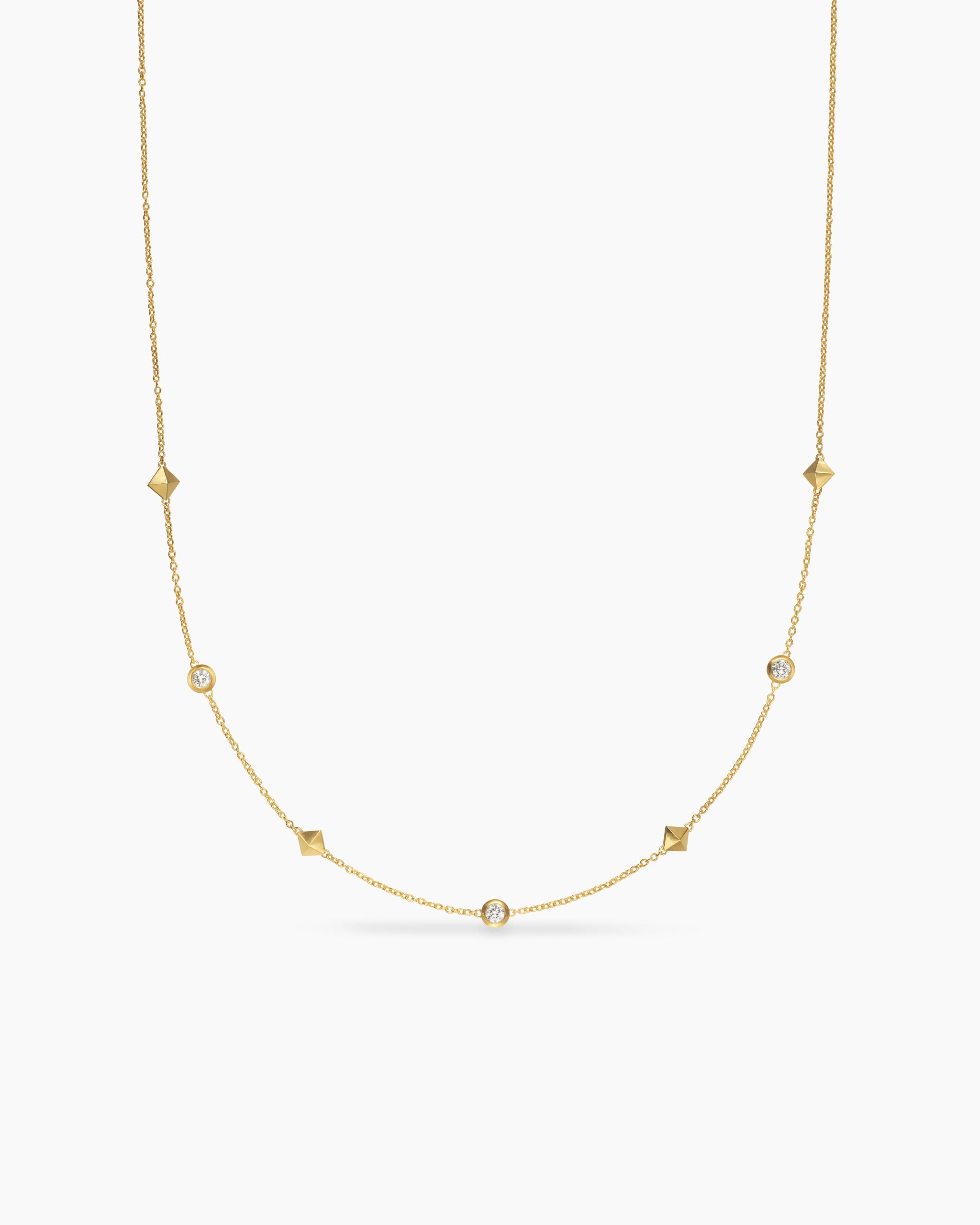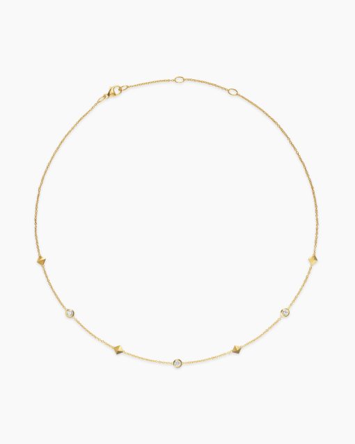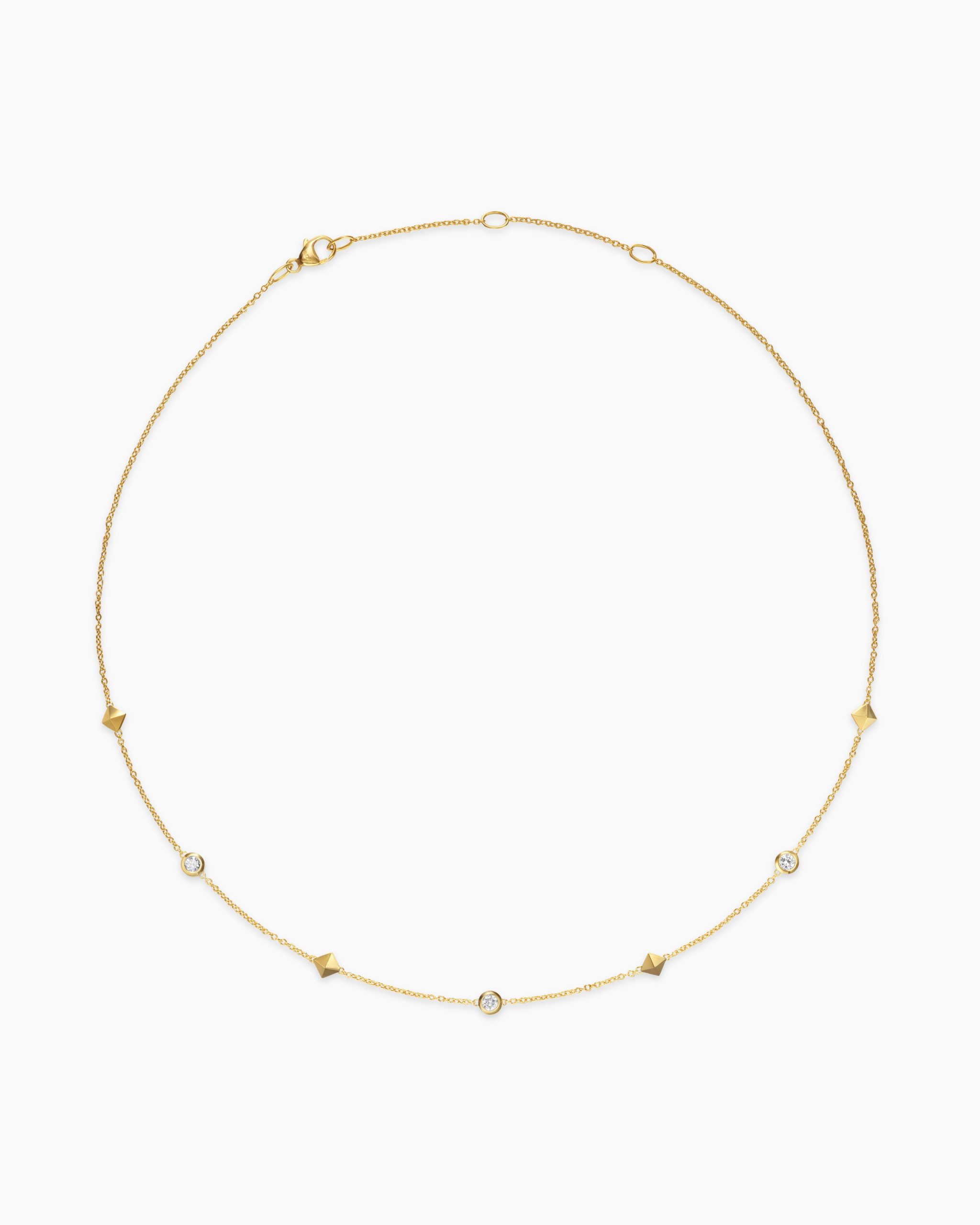 This design references the pyramid—an enduring form that connects us to our ancient roots in art, architecture and design.18-karat yellow goldBezel-set diamonds, 0.17 total carat weightAdjustable length, 14-16inNecklace, 4.6mmChain, 1.1mmLobster clasp