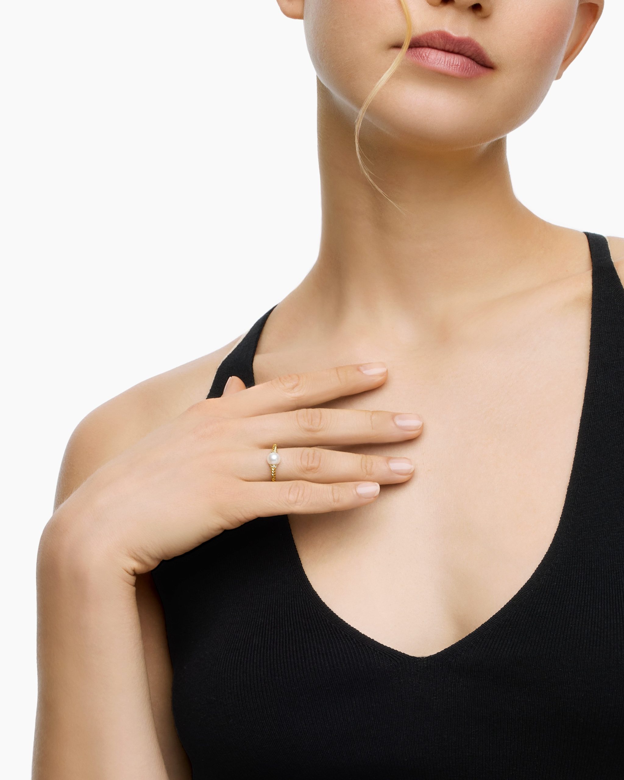 Like the sun for which it is named, Solari marks David Yurman’s return to the sphere as the centerpiece of a collection. Evolved from Orbit, which debuted in 2005, the elemental shapes embody the simplicity of modern sophistication. 18-karat yellow goldAkoya white pearl, 6mmPavé diamonds, 0.08 total carat weightRing, 2.3mmCablespira® is a patented DY construction that is highly flexible and exceptionally comfortable to wear.