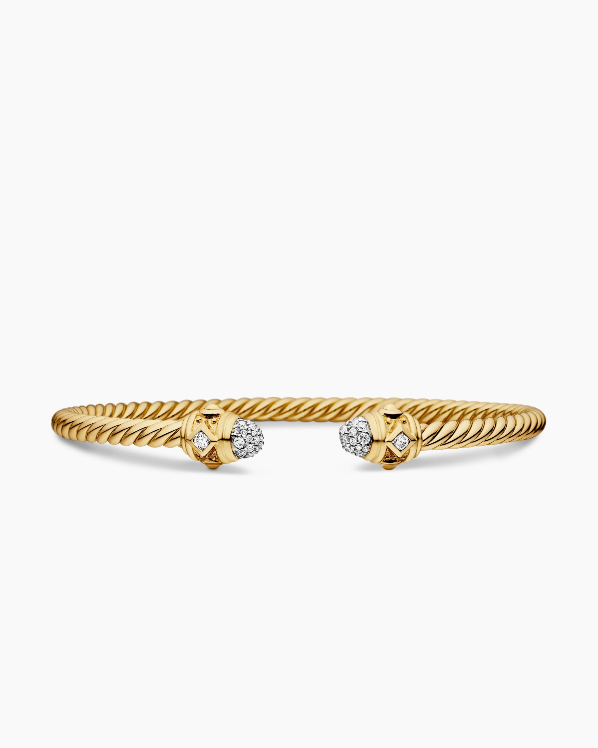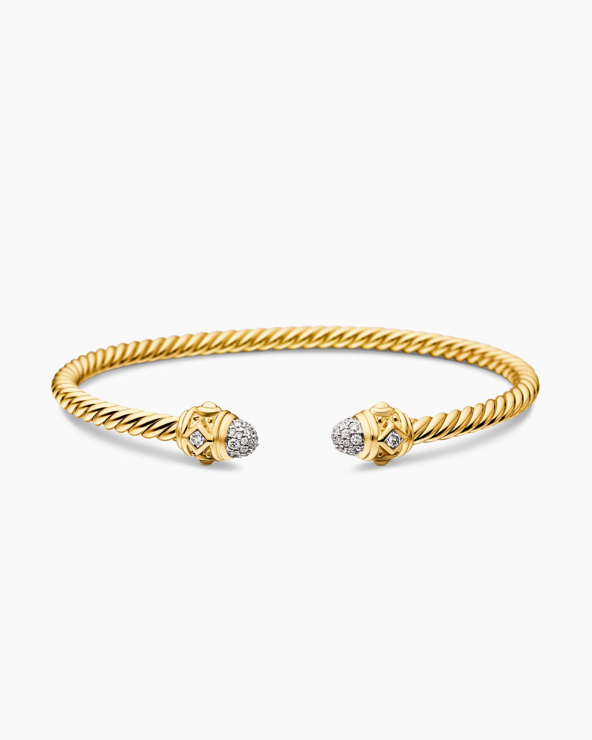 A David Yurman icon, the Renaissance Cable Bracelet combines sculptural form with the brilliant jewel tones found in classical painting. 18-karat yellow goldPavé diamonds, 0.35 total carat weightBracelet, 3.5mmFlexible designCablespira® is a patented DY construction that is highly flexible and exceptionally comfortable to wear.
