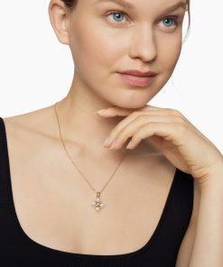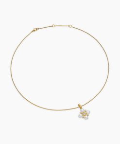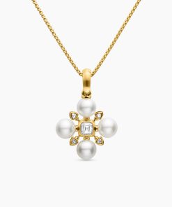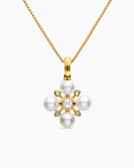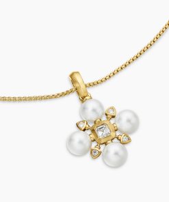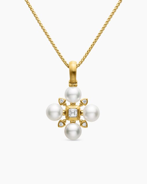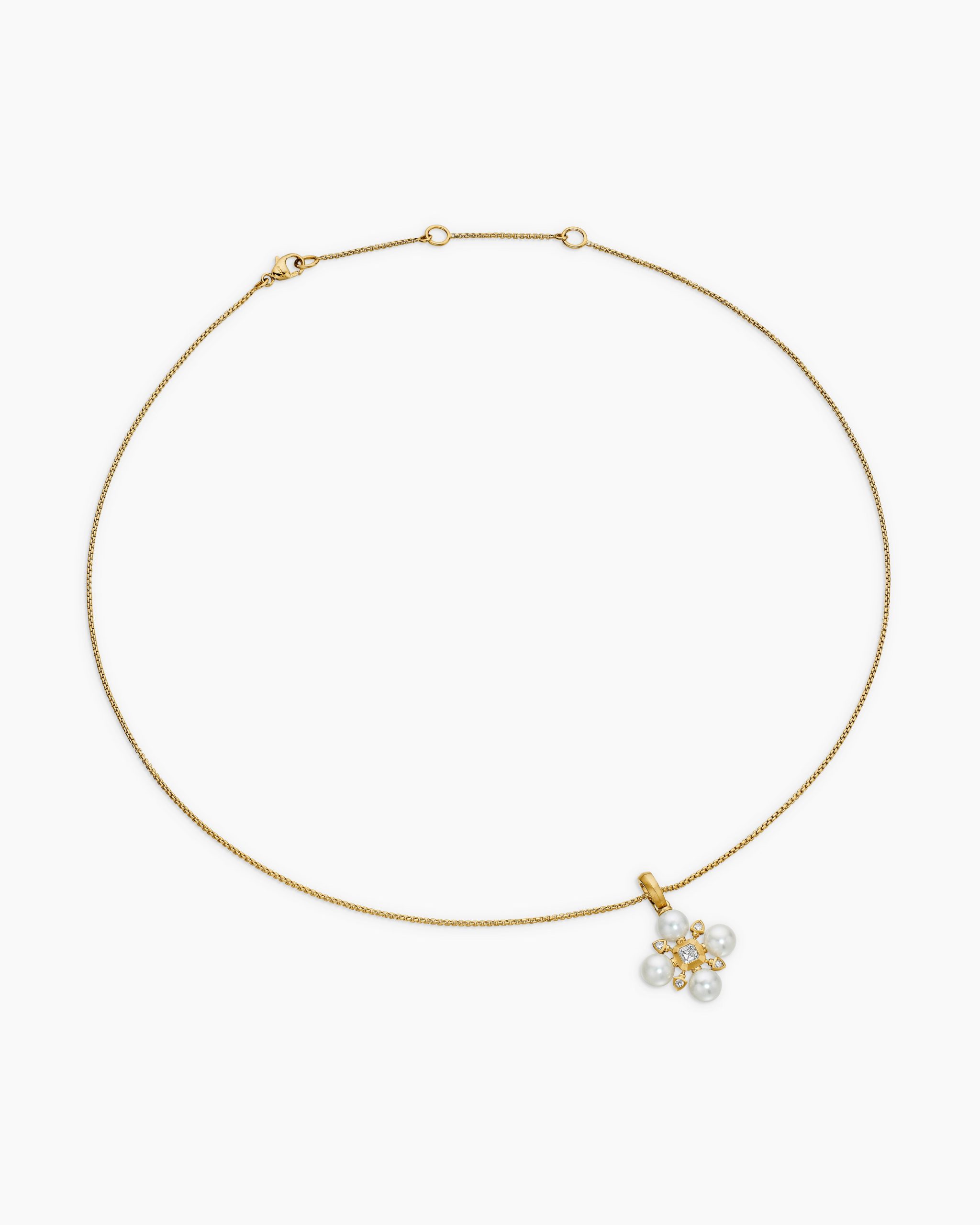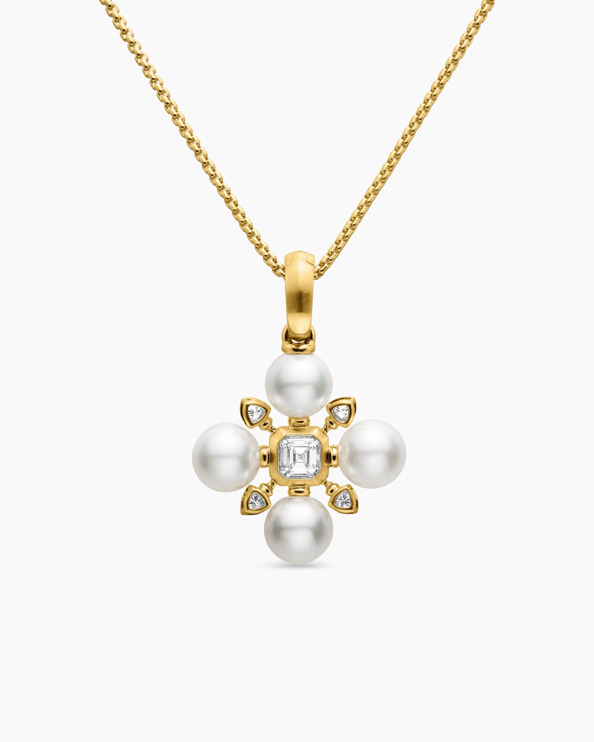 Referencing the art and architecture of the Renaissance period in Europe, this elegant piece combines the quatrefoil motif—long a part of David’s design vocabulary—with the iridescent glow of pearls. 18-karat yellow goldAkoya white pearls, 5-5.5mmDiamonds, 0.20 total carat weightAdjustable length, 16-18inNecklace 20 x 17.5mmChain, 1.0mmLobster claspFunctioning bail allows pendant to attach to a necklace or bracelet.