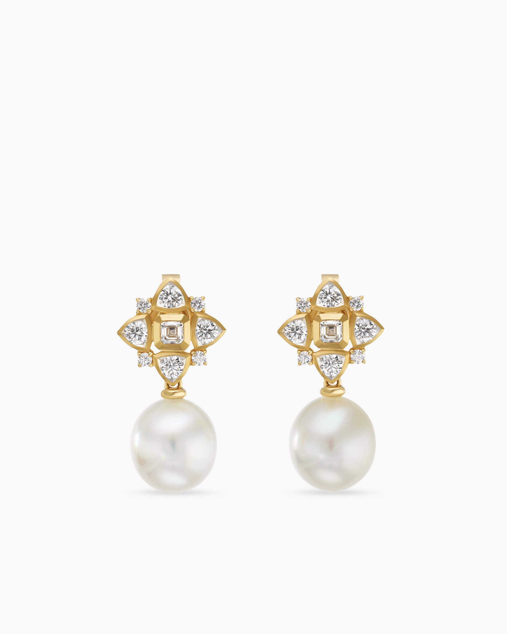 Referencing the art and architecture of the Renaissance period in Europe, this elegant piece combines the quatrefoil motif—long a part of David’s design vocabulary—with the iridescent glow of pearls. 18-karat yellow goldCultured south sea white pearls, 11-12mmDiamonds, 1.29 total carat weightEarrings, 26 x 14mmPearls are detachable