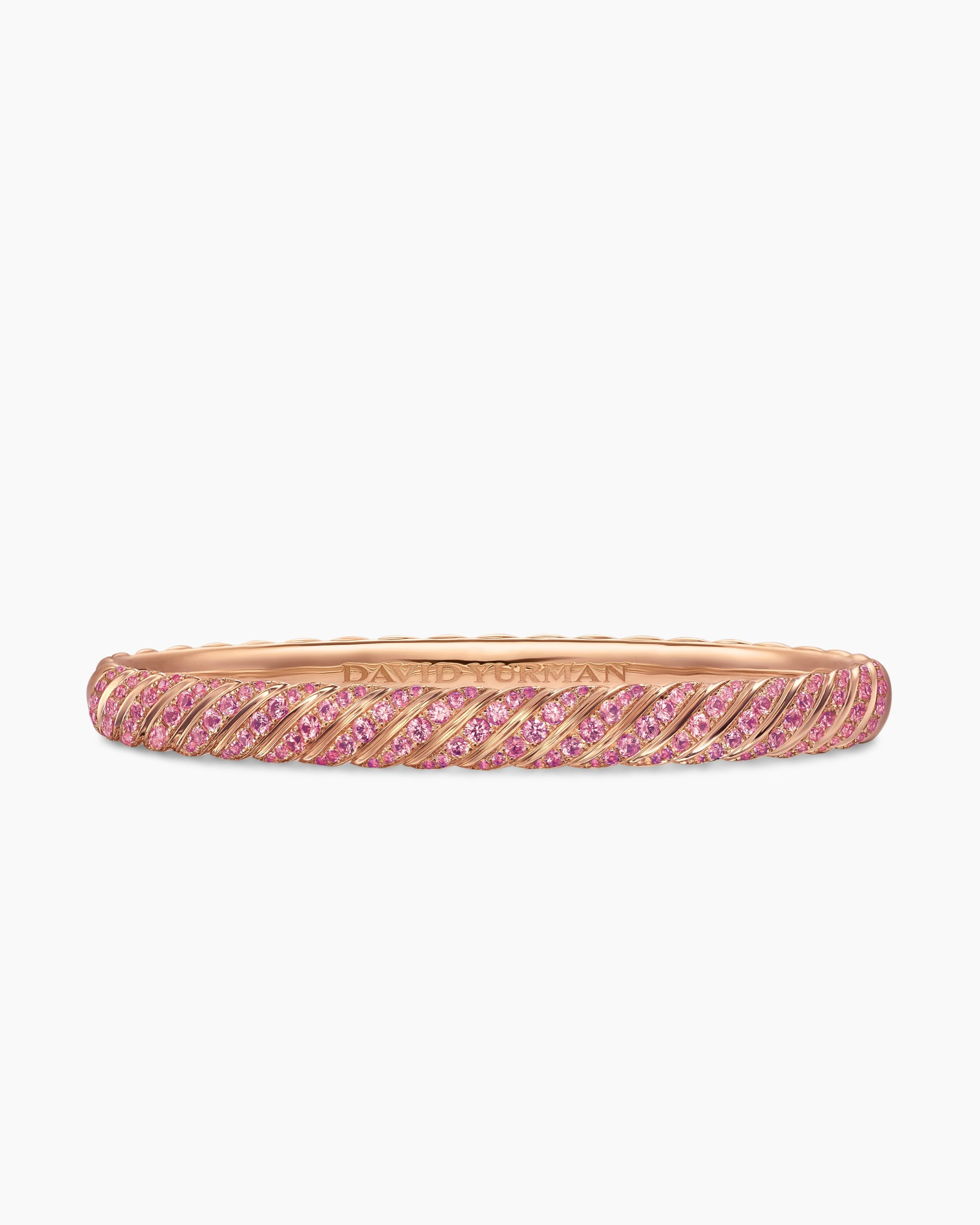 Inspired by his love of architecture and bas-relief sculpture, Evan Yurman designed this modern form by deconstructing Cable—the house’s signature motif—to its essence. Each timeless design is a wearable work of art. Precious metals are meticulously carved with mesmerizing wavelike patterns that dramatically catch the light. Elegant curves highlight the sensuality of the body.Inspired by Miami’s magnetic atmosphere, landscapes, and tropical sunsets, vibrant designs feature bold and semi-precious stones in electric pinks, neon greens, cobalt blues, and fiery oranges. These dynamic and radiant pieces embody the excitement and vitality of the city.Visit our Miami Design District flagship and learn more about the store’s dramatic design.18-karat rose goldPavé-set pink sapphires, total carat weight ranges from 1.98 to 2.77 (dependent on size)Bracelet, 6.2mmHinge claspThis item can be engraved. Please contact customer care for more information.