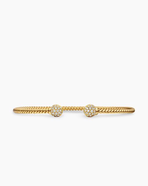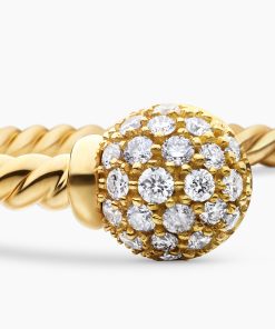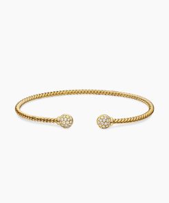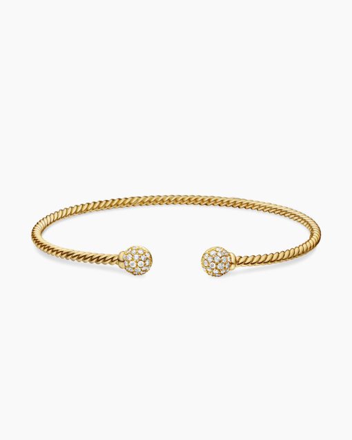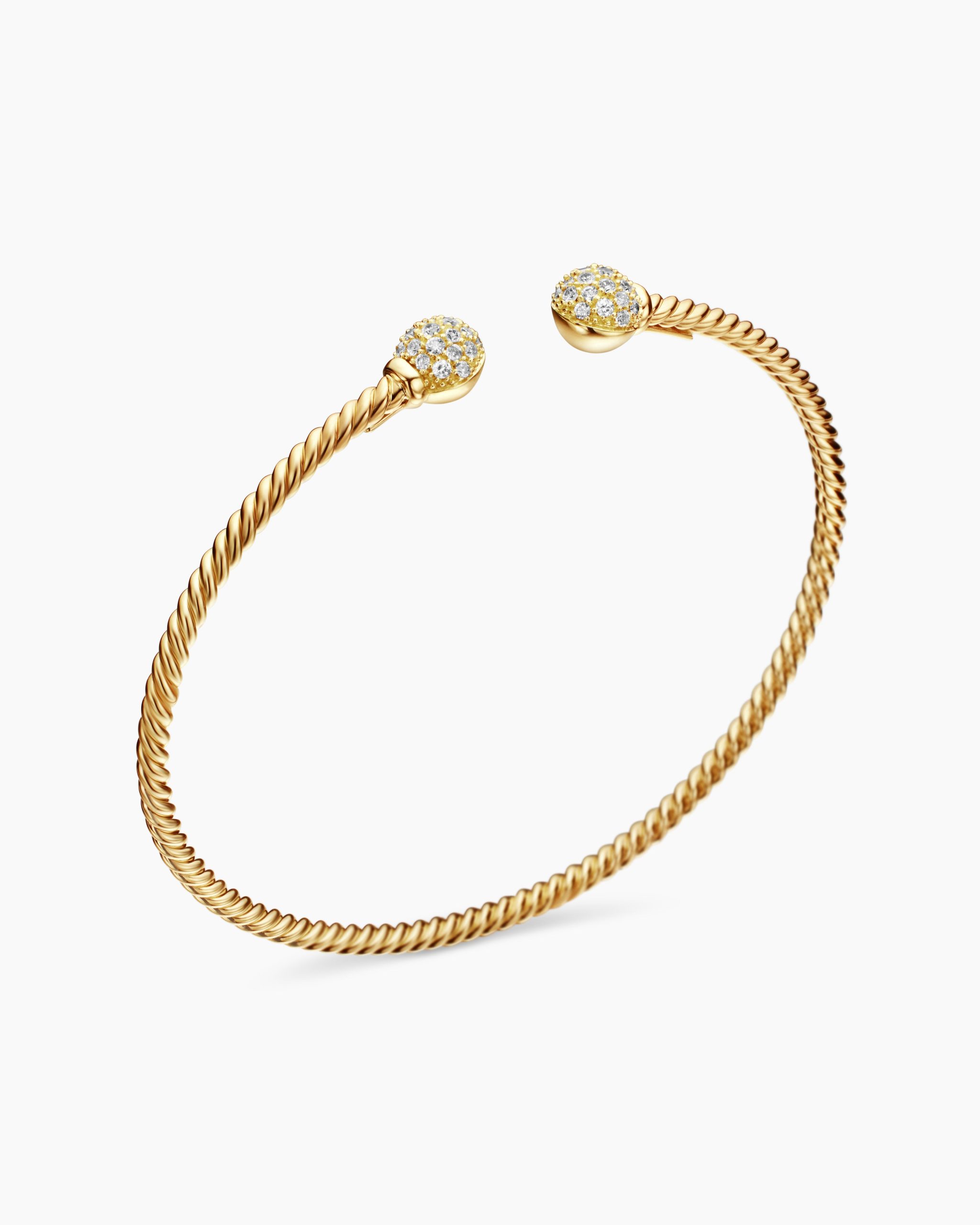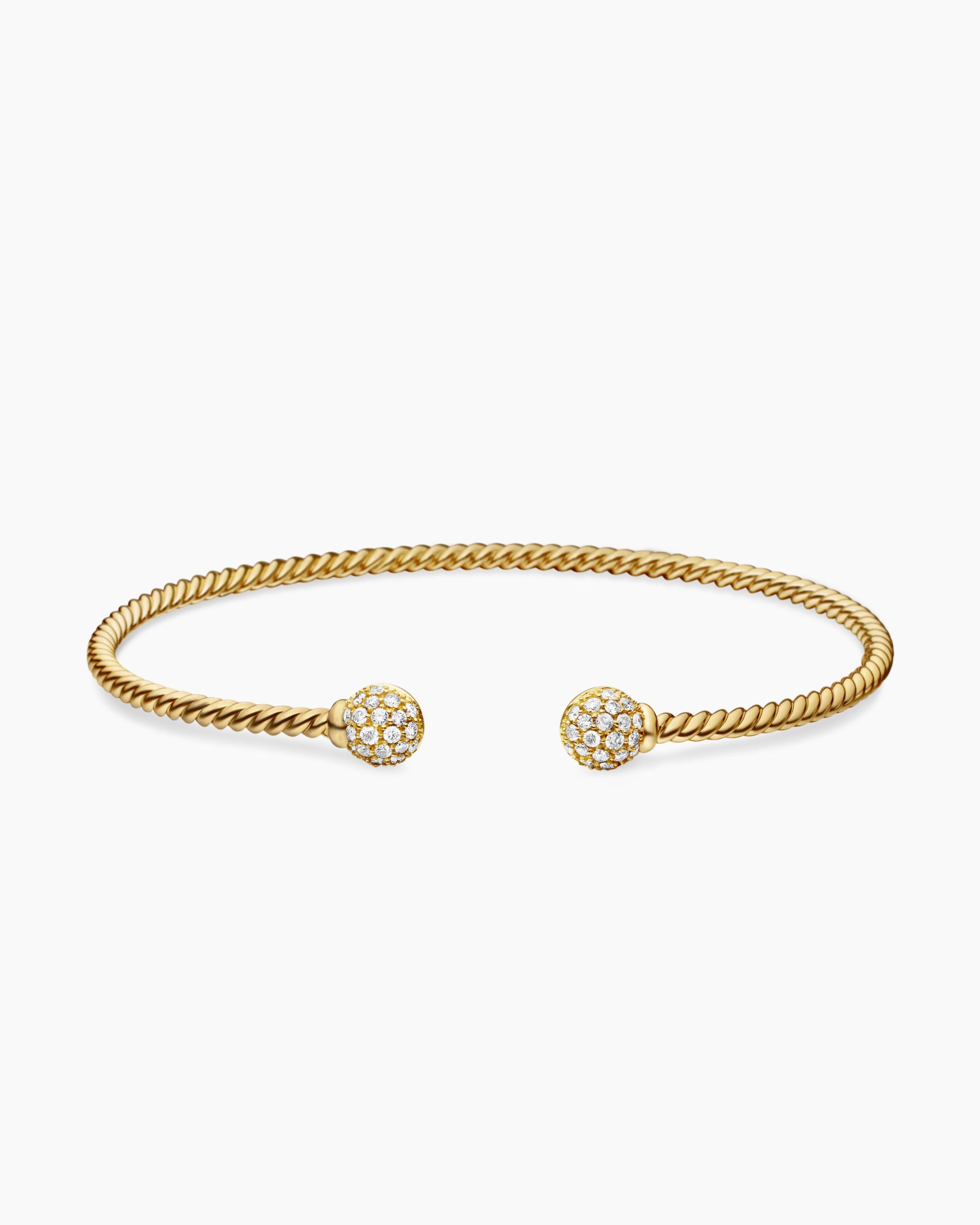 Like the sun for which it is named, Solari marks David Yurman’s return to the sphere as the centerpiece of a collection. Evolved from Orbit, which debuted in 2005, the elemental shapes embody the simplicity of modern sophistication. 18-karat yellow goldPavé diamonds, 0.35 total carat weightBracelet, 2.6mmBeads, 6mmCablespira® is a patented DY construction that is highly flexible and exceptionally comfortable to wear.