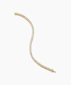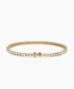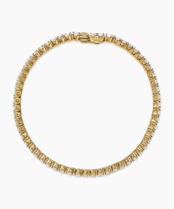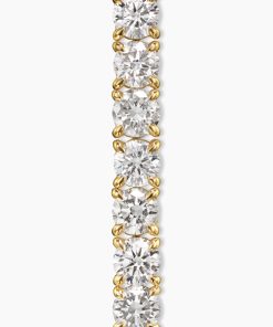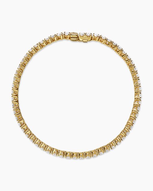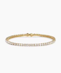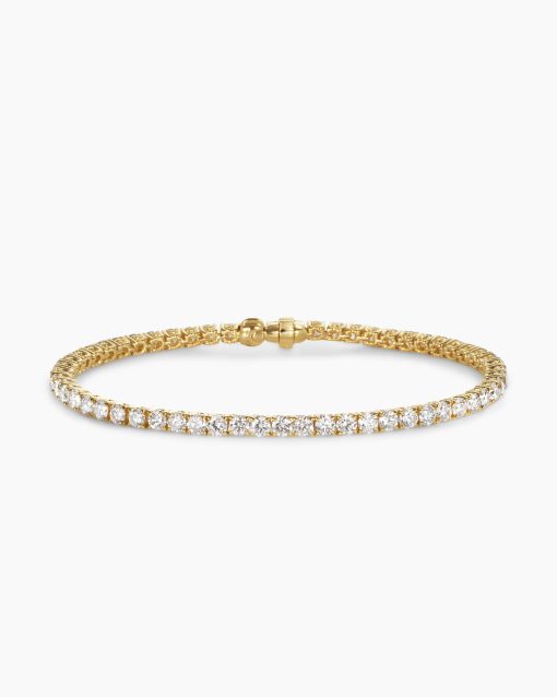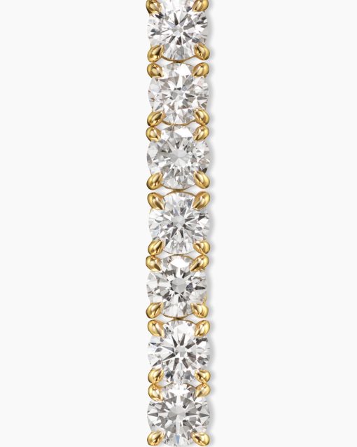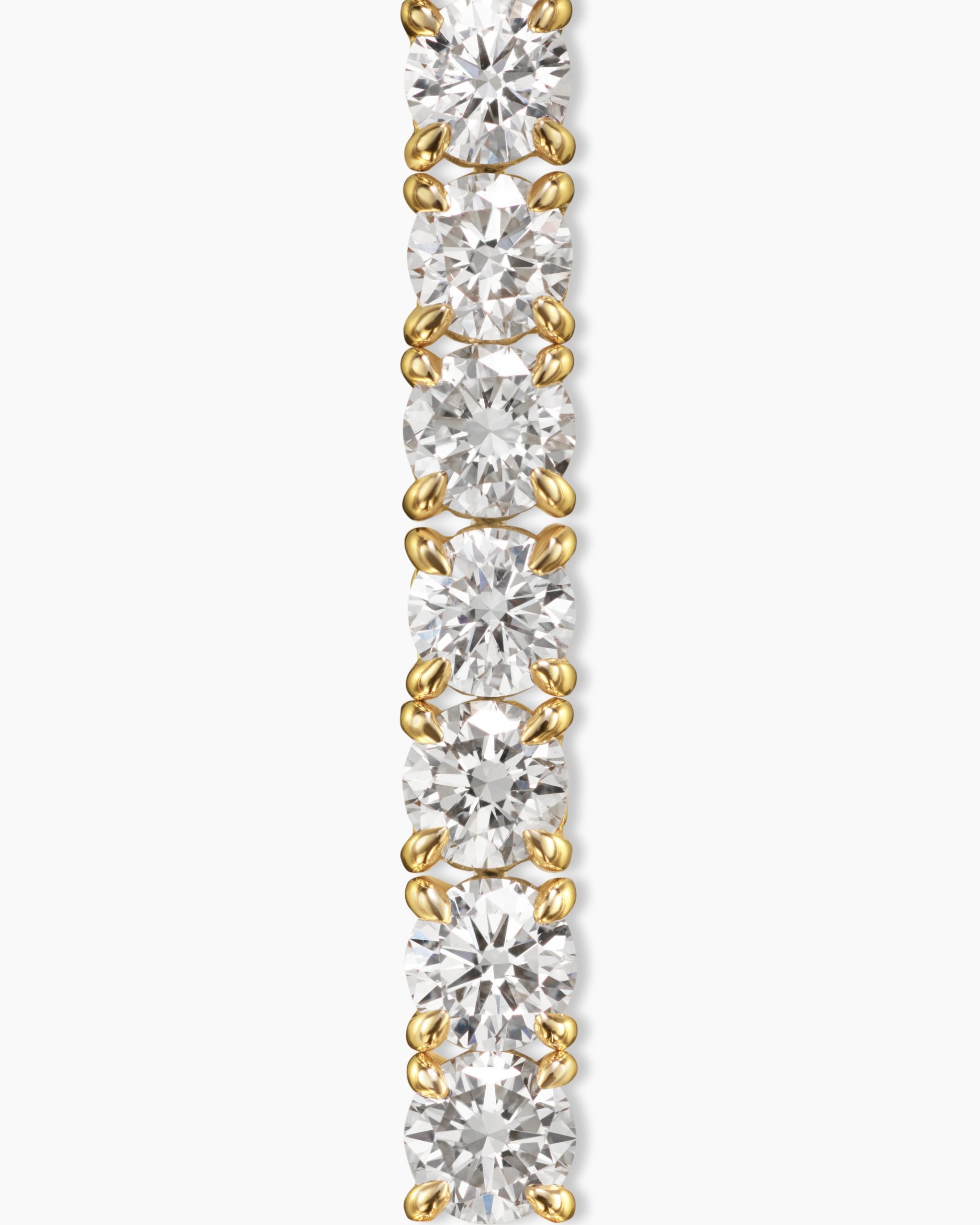Ever since Chris Evert’s diamond bracelet flew off her wrist at the 1978 US Open, this style has been known as a “tennis bracelet”—a continuous line of bezel or prong-set diamonds. Now expanded to include necklaces, our elegant new additions come in both 18K yellow and white gold with hand-set stones. 18-karat yellow goldProng-set diamonds, 6.16 total carat weightBracelet, 3mmPush clasp